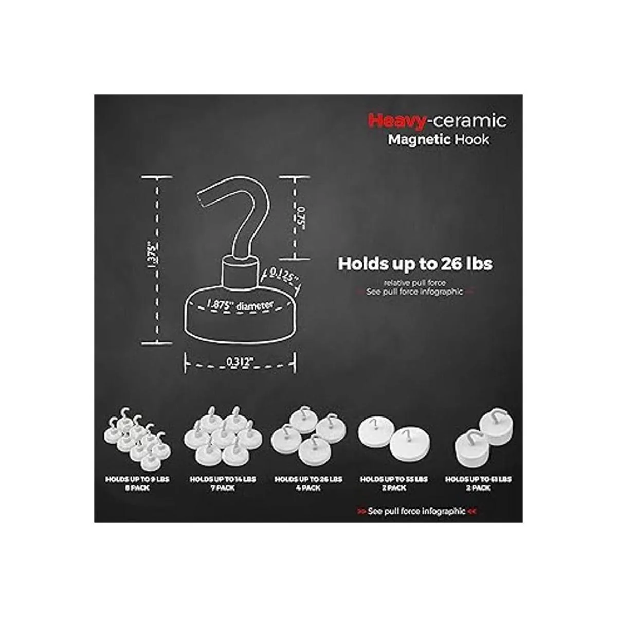 Soporta hasta 26 libras: este gancho magnético puede soportar hasta 26 libras de peso, según lo determina nuestra prueba de fuerza de tracción estándar de la industria. Utiliza estos potentes ganchos para colgar luces, cableado, herramientas, llaves, carteles y más de puertas de metal, estantes, cajas de herramientas y archivadores. Deja que Master Magnetics te ayude a montar y organizar tu espacio deseado con nuestro paquete de 4 ganchos magnéticos.