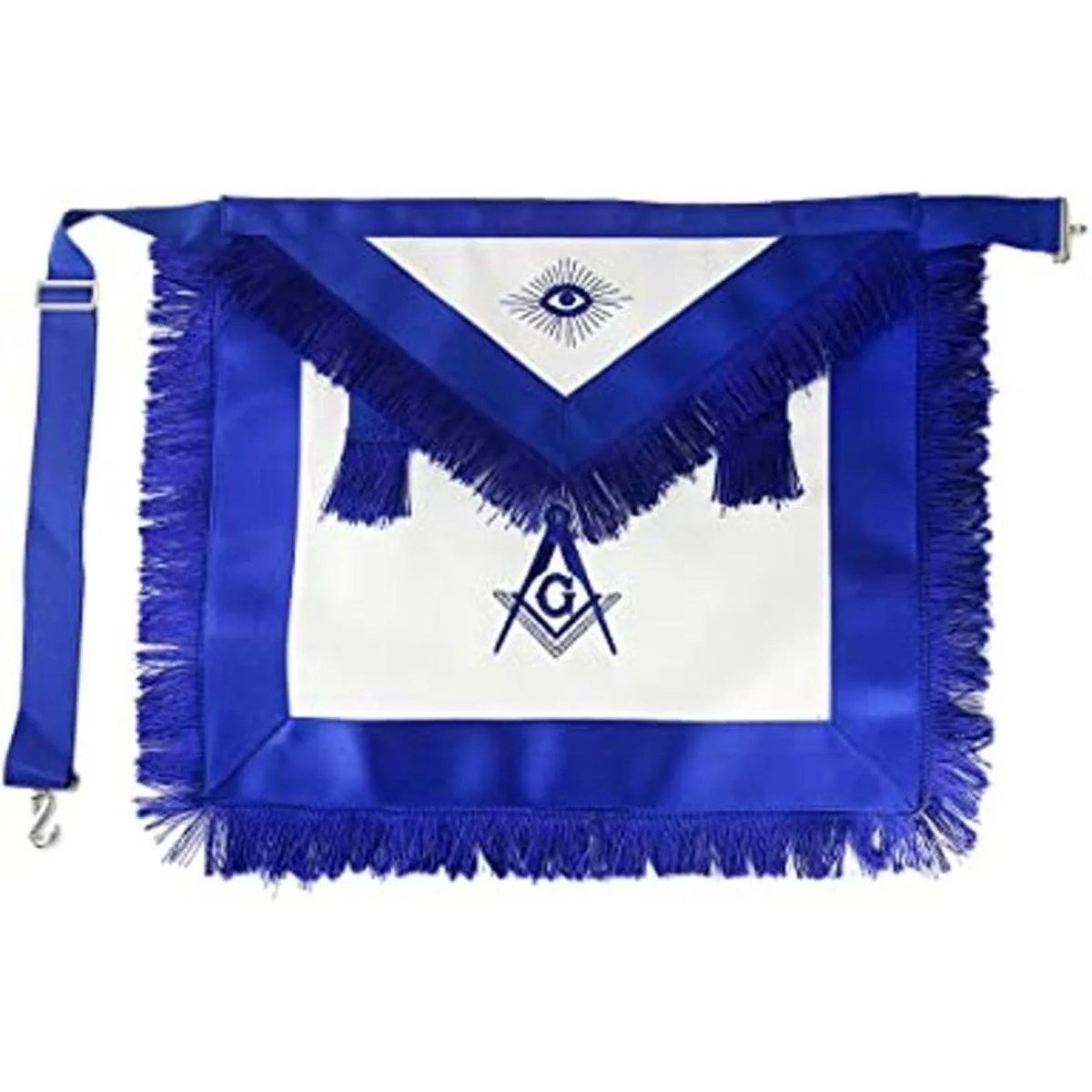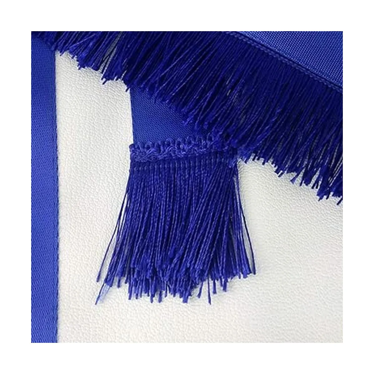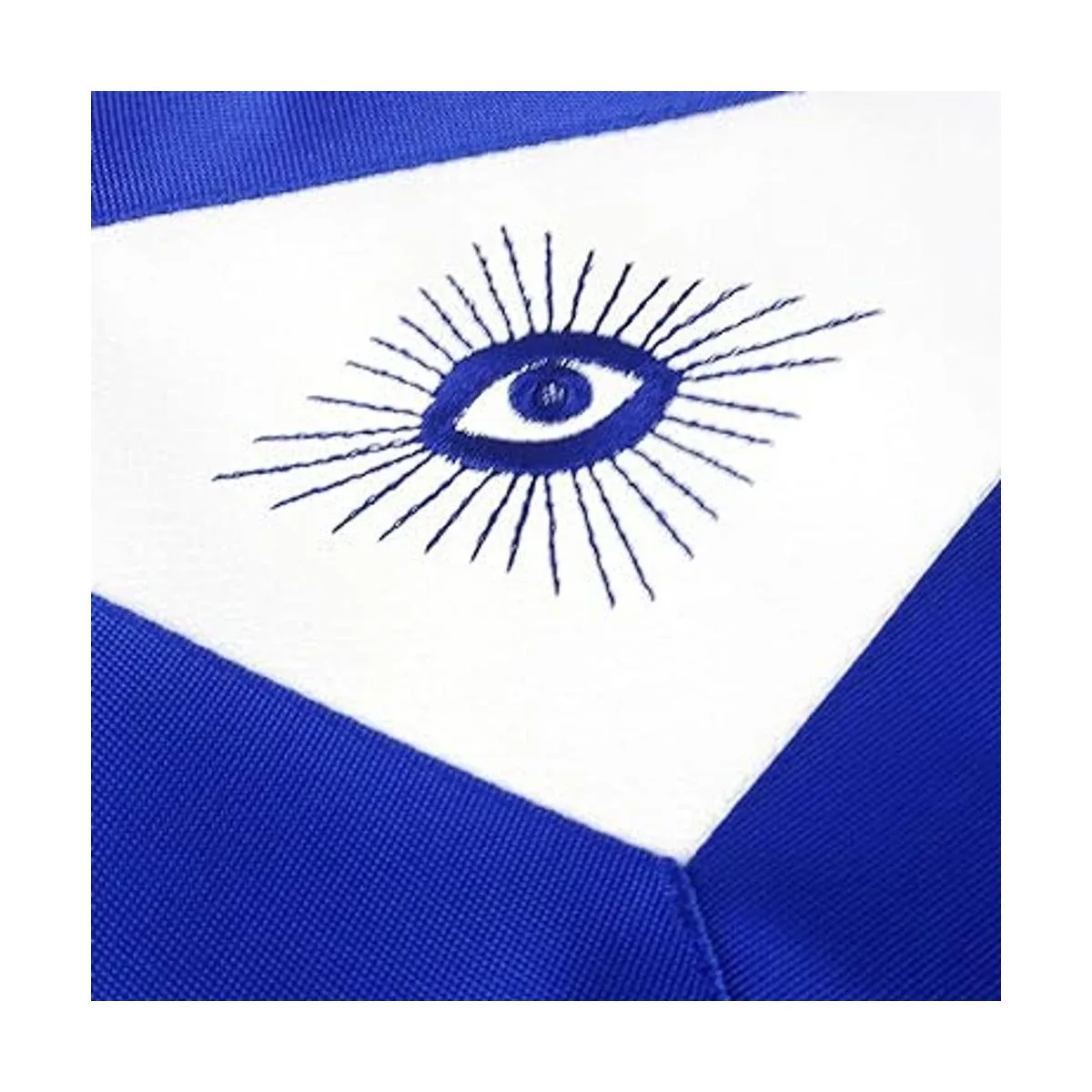 Símbolo ojo masónico, cuadrado y brújula con bordado azul en el anverso y flecos de tela azul