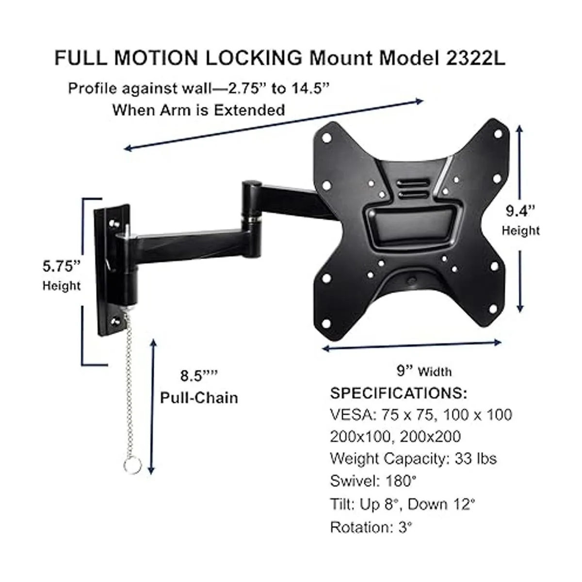 Master Mounts 2322L2 Brazo articulado portátil de viaje para TV RV que permite que 1 televisor se utilice en 2 lugares, mantiene la TV segura en vehículos móviles de hasta 50 pulgadas y 200 x 200 pulgadas