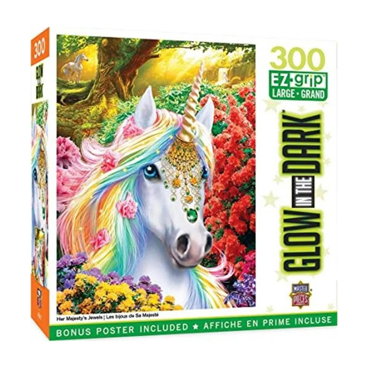 Acabado mate: nuestro acabado mate ayuda a reducir el deslumbramiento para una mejor experiencia de rompecabezas. Aquí está lo que aparece en esta colección Glow In The Dark Ez Grip Unicornio majestuoso adornado con joyas brillantes.
