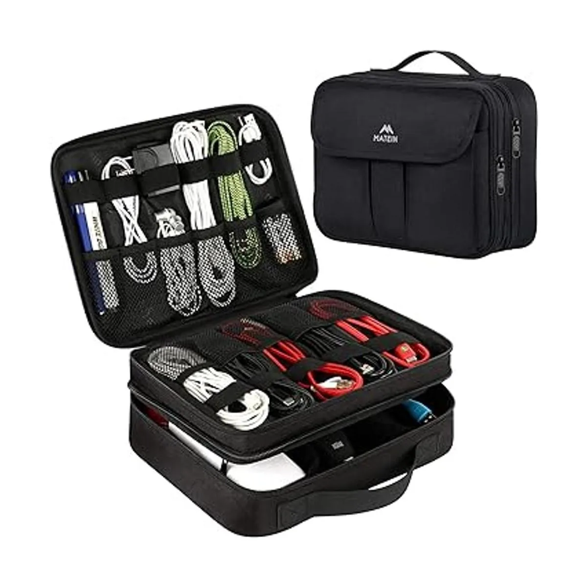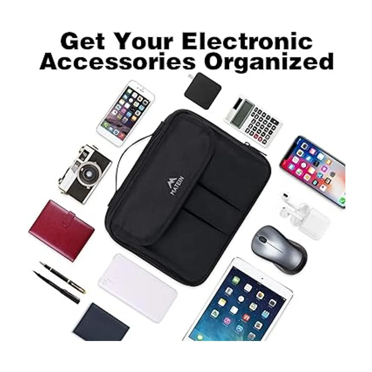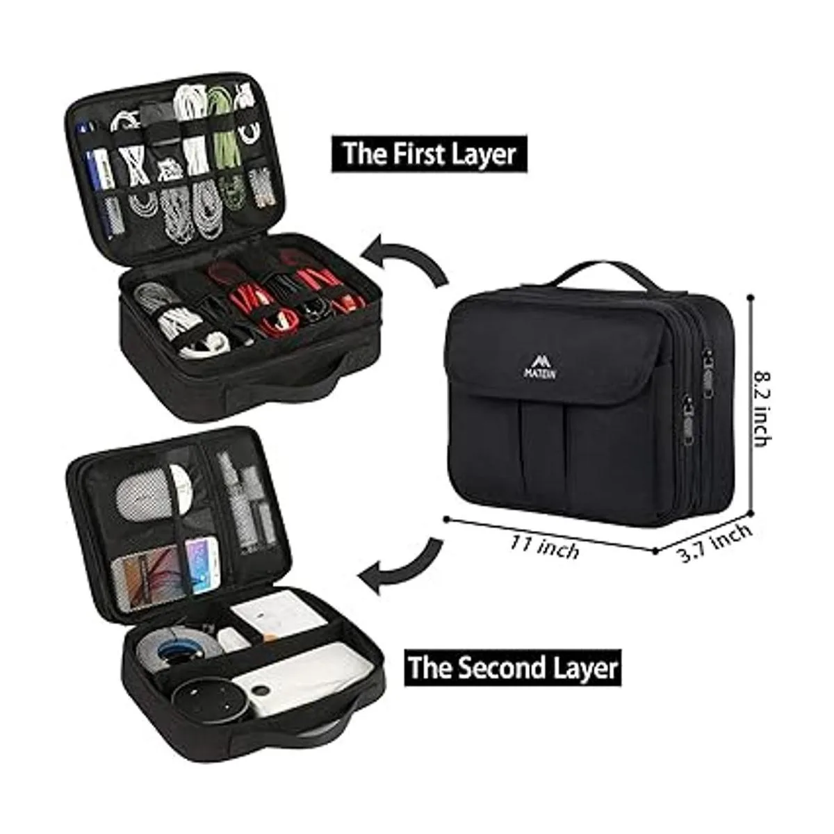 Matein Organizador de electrónica, impermeable, funda de accesorios electrónicos de viaje, bolsa de almacenamiento portátil de doble capa para cable, cargador, banco de energía, unidad flash, teléfono, iPad Mini, tarjeta SD, tablet, color negro