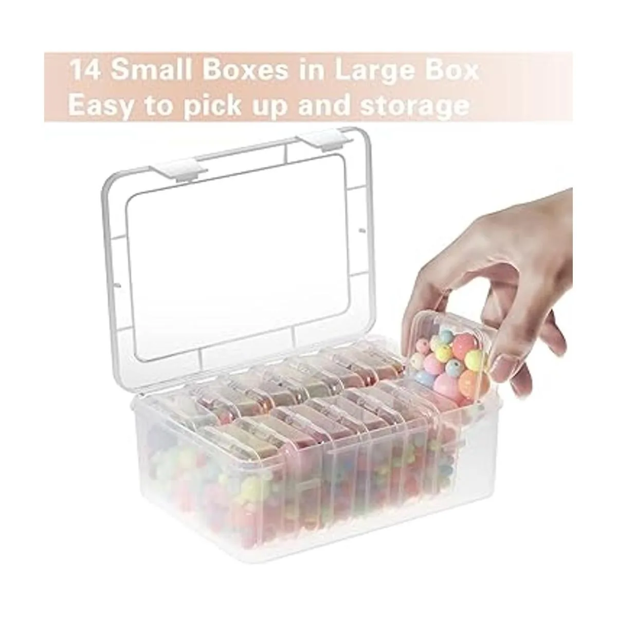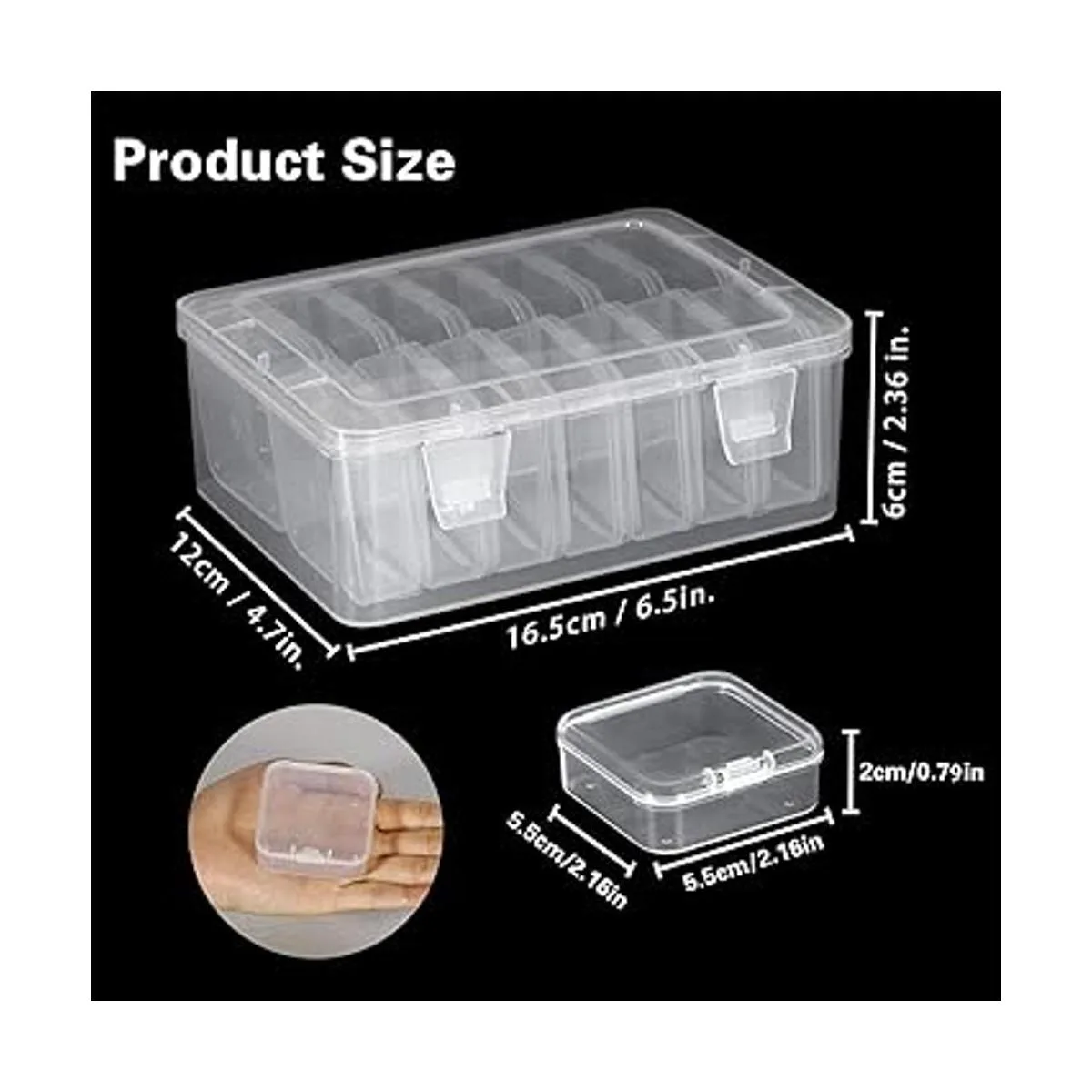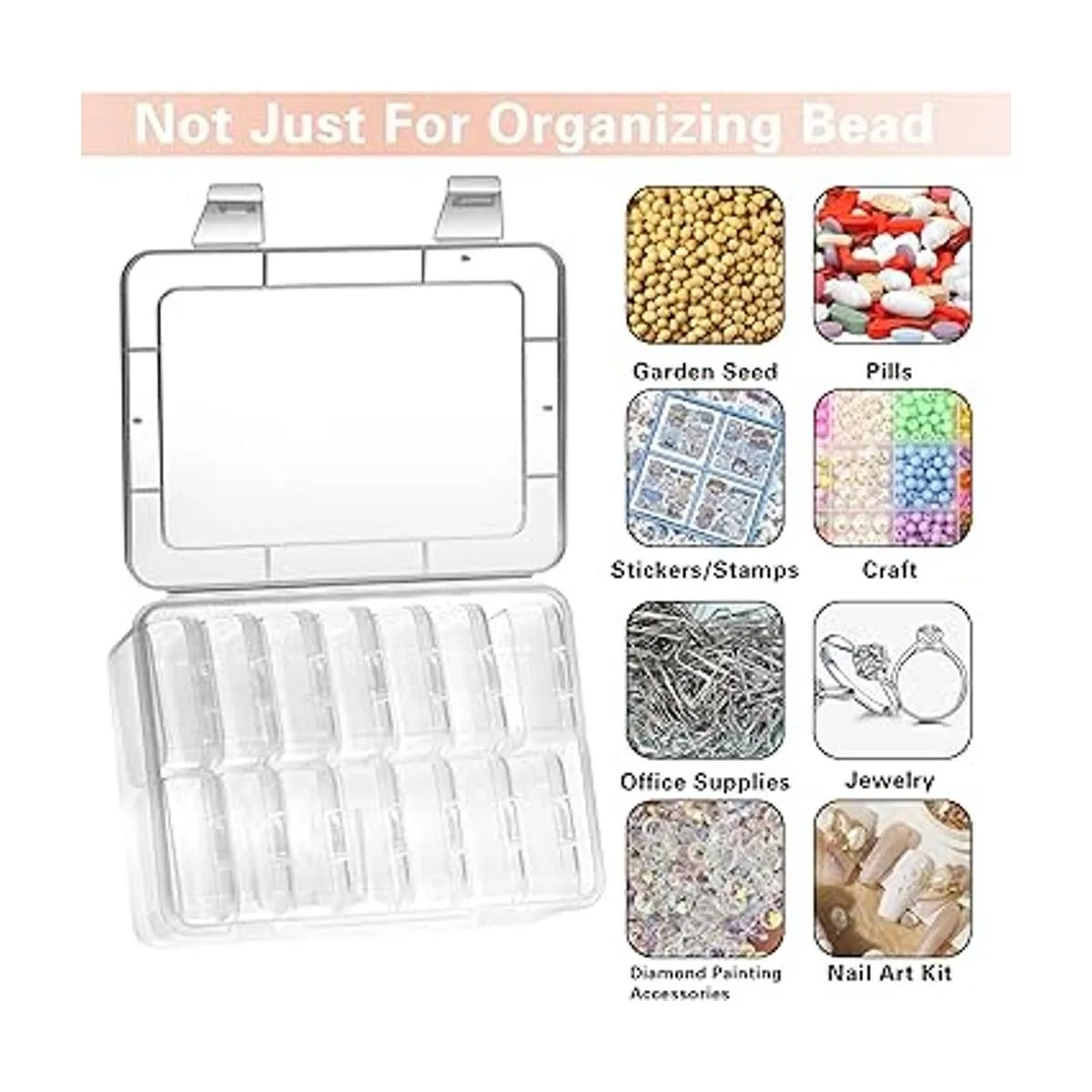 Aplicaciones: perfecto para organizar y almacenar objetos pequeños: colección de rocas, pequeños accesorios, aretes, anillos, collares, hilos, cuentas; gancho de pesca, cebo de señuelo de peces; letras de tablero de cartas, pastillas, medicamentos pequeños, componentes electrónicos, manualidades de arte, uñas, tuercas y pernos, etc. También puedes utilizar un bolígrafo para marcar estas cajas con números o fechas para hacer que tu organización sea más divertida.