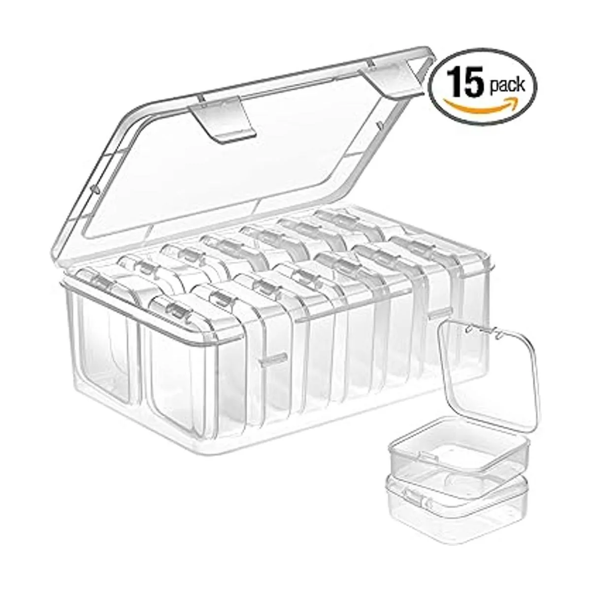 Mathtoxyz Organizadores de cuentas pequeñas, 15 cajas de almacenamiento de plástico, mini contenedores de almacenamiento de cuentas transparentes, cajas transparentes con tapa con bisagras y estuche de suministro transparente rectangular para manualidades