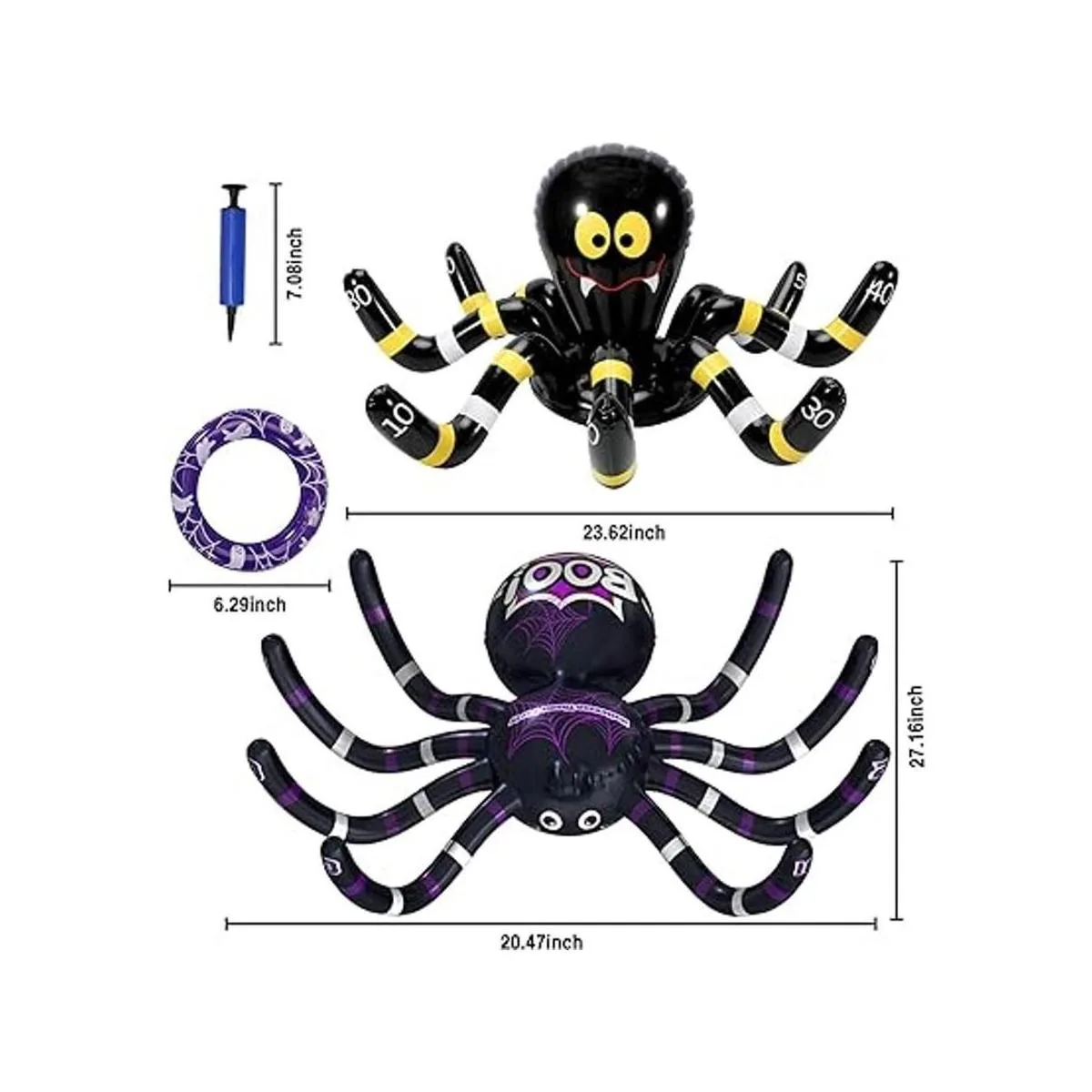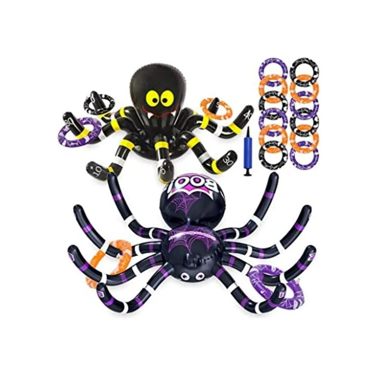 Juego de lanzamiento de anillos de araña: el juego inflable de lanzamiento de anillos incluye 12 anillos inflables 6.3 pulgadas, 2 tipos de arañas 27 x 20.5 pulgadas 23.6 x 23.6 pulgadas y 1 bomba. Añade diversión a tu fiesta de Halloween con este juego inflable de lanzamiento de anillos.