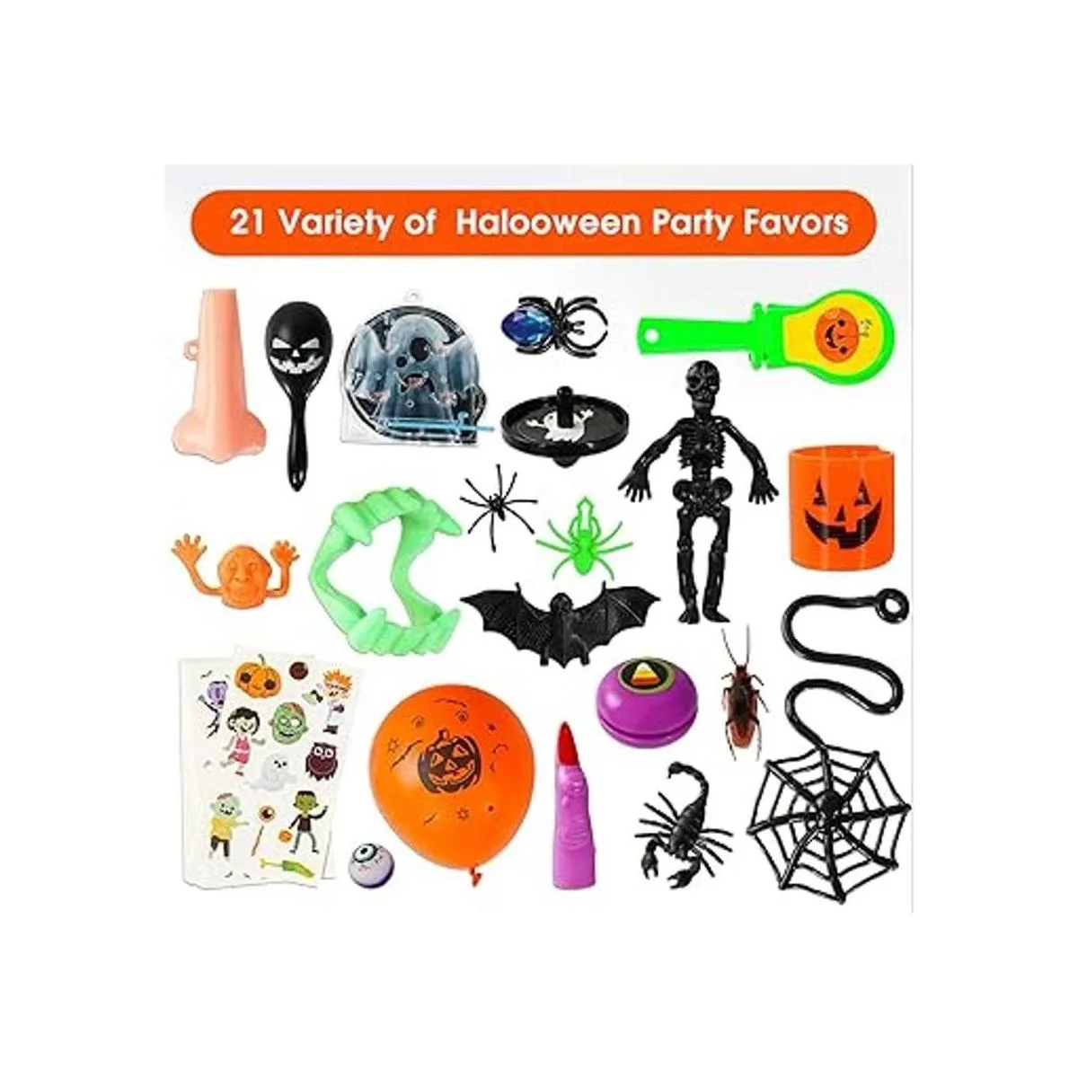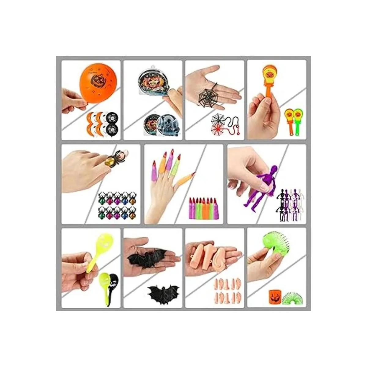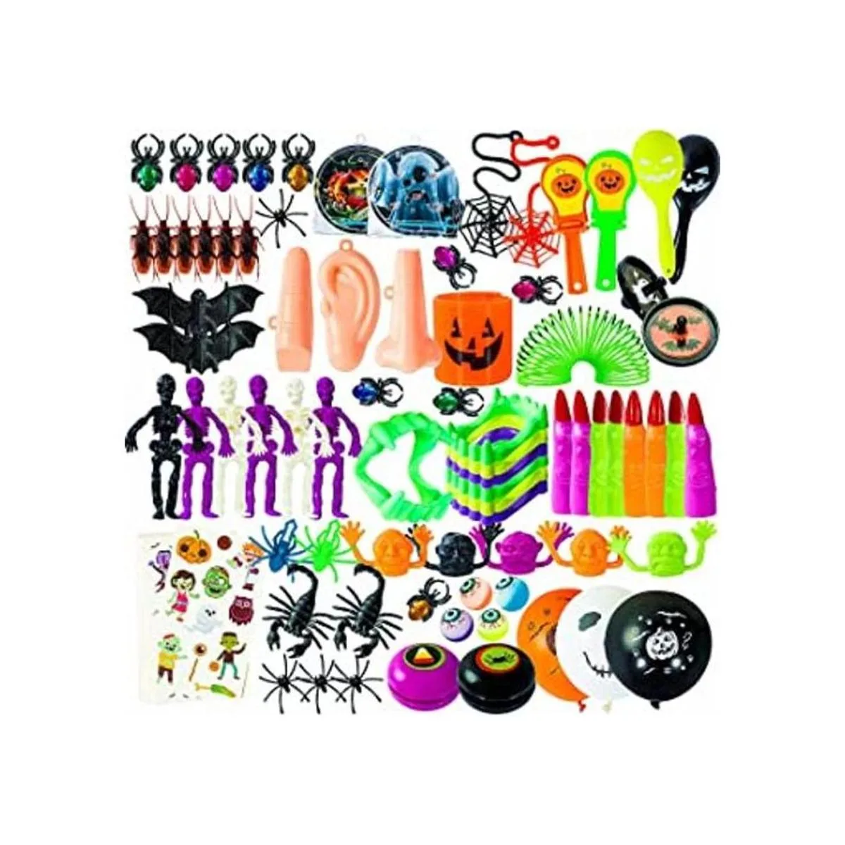 Gran surtido Estos juguetes de fiesta de Halloween vienen en 17 tipos de juguetes surtidos 122 piezas. Incluyen una amplia gama de juguetes como: Pelotas de ojos que rebotan, tambores de calabaza, yoyos, trompitos, silbatos de oreja/nariz/dedos, resortes de arcoíris, tatuajes, globos y mucho más artículos divertidos.