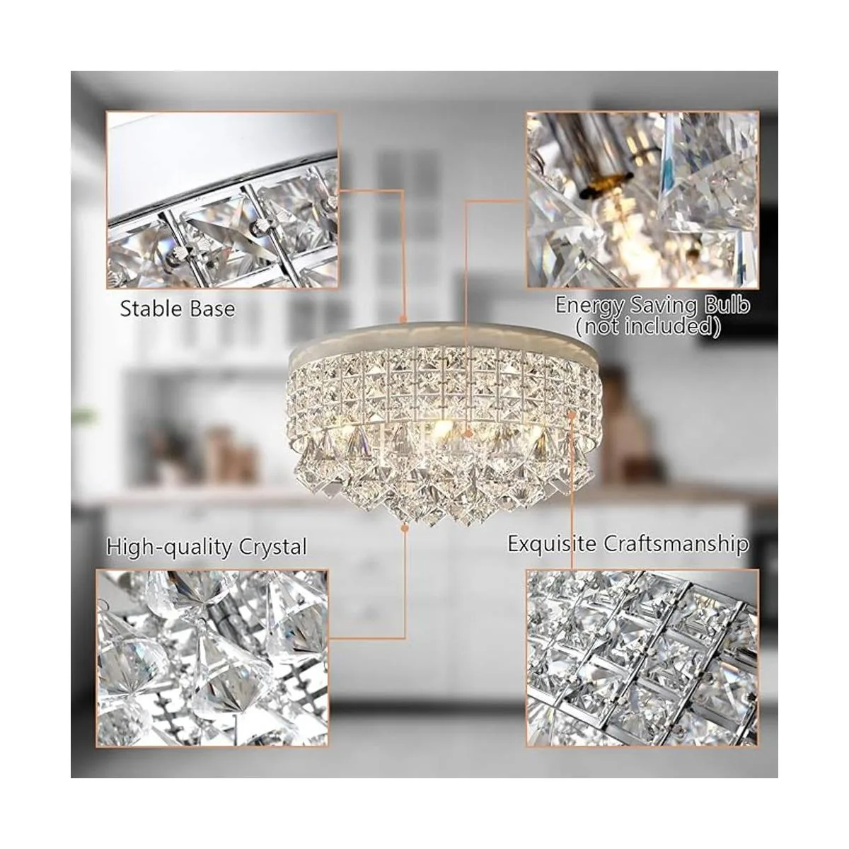 Maxax Lámpara de araña de cristal de 4 luces, moderna lámpara de techo de tambor, montaje al ras de lluvia, pantalla redonda de metal, para comedor, sala de estar, baño, dormitorio, cromo