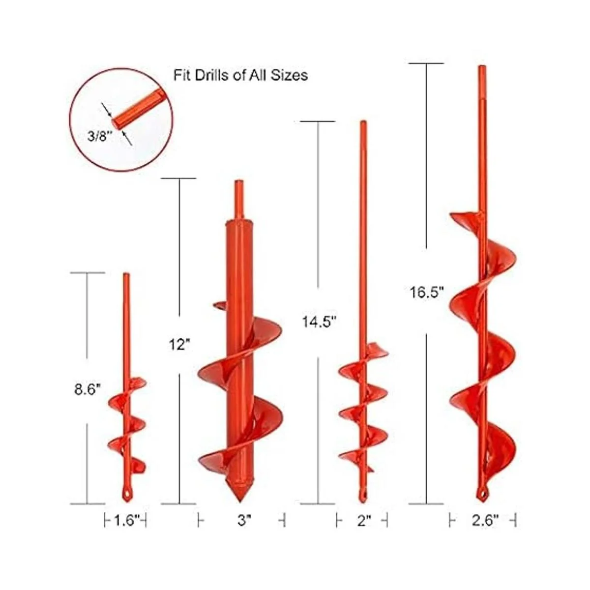 Juego de 4: las barrenas de jardín vienen en 4 tamaños, 1.6 x 8.6 pulgadas, 3 x 12 pulgadas, 2 x 14.5 pulgadas, 2.6 x 16.5 pulgadas. La broca viene con una unidad antideslizante de 3/8 pulgadas que será un mejor kit de herramientas para cavar agujeros en tu patio.