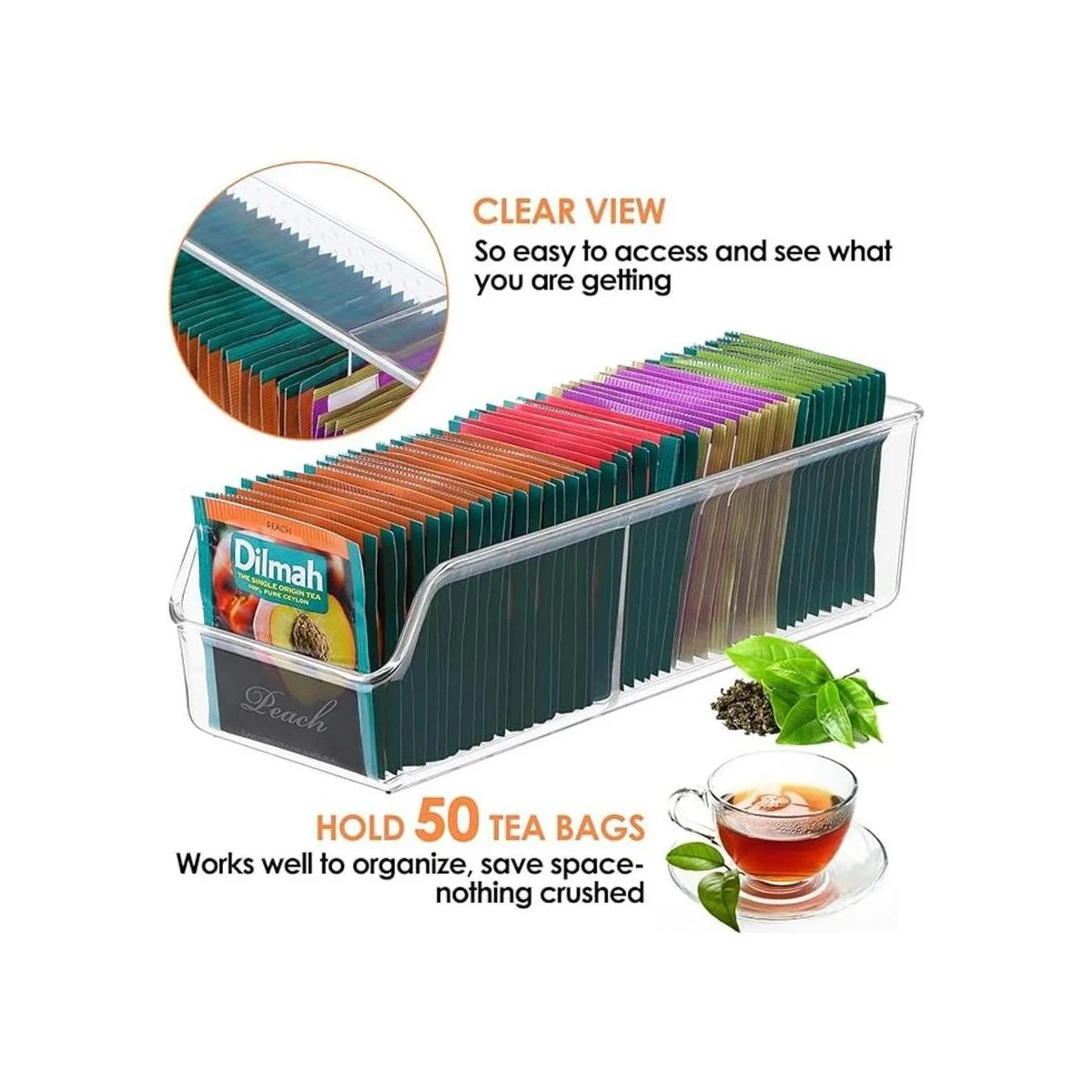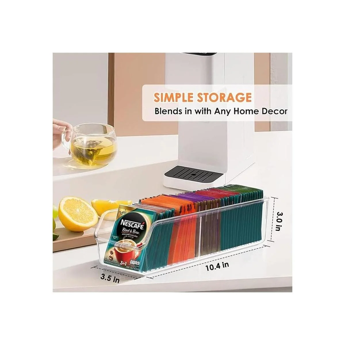 Gran capacidad: 10.4 x 3.5 x 3 pulgadas con 2 compartimentos que te permiten almacenar una gran cantidad de tus bolsas de té, paquetes de azúcar, edulcorantes, cremas, cápsulas de bebidas, aperitivos, bolsas de especias, mezclas de aderezos, chocolate caliente, etc. Puede contener 3540 paquetes.