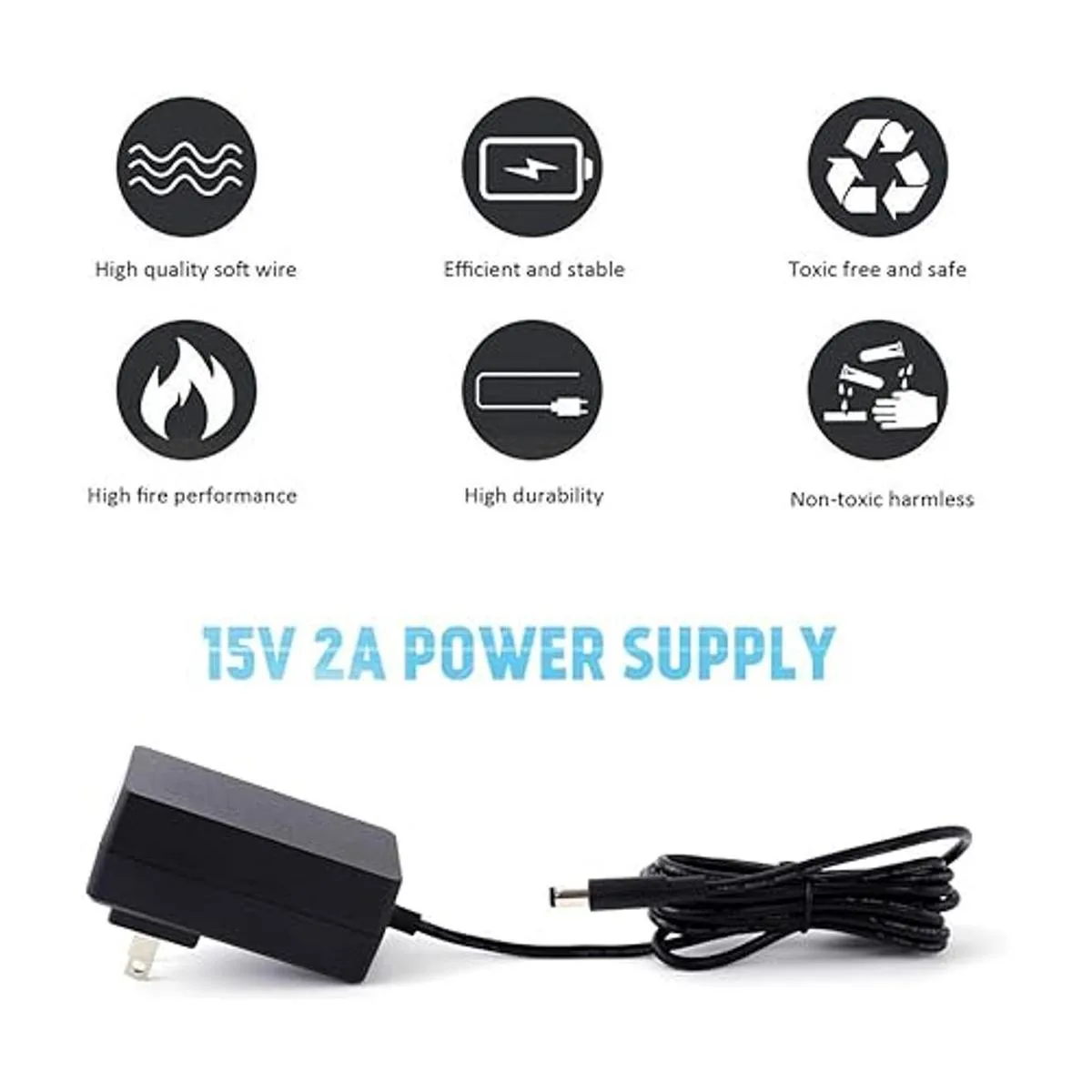 Uno de los adaptadores de corriente de 15 V de la mejor calidad en : 3 años de garantía de reemplazo gratuito Corte de sobrecarga de corriente Térmico automático Protección contra cortocircuitos Alta eficiencia Baja fiebre y sin ruido Potencia completa 30 W Larga vida útil Caja de embalaje de alta calidad a prueba de golpes Caja de plástico negro segura