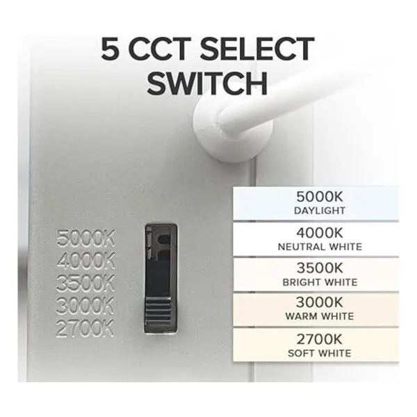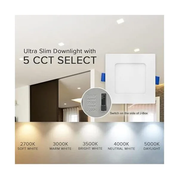 5 CCT Select de 2700K/3000K/3500K/4000K/5000K te permite elegir cualquier color de luz que prefieras utilizando fácilmente el interruptor en el lateral de la caja J que viene con esta delgada luz empotrada