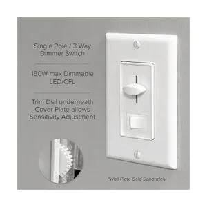 Funciona con bombillas LED, halógenas e incandescentes. La esfera recortada debajo de la placa de cubierta permite un ajuste de sensibilidad al instalar para lograr la compatibilidad con lámparas LED