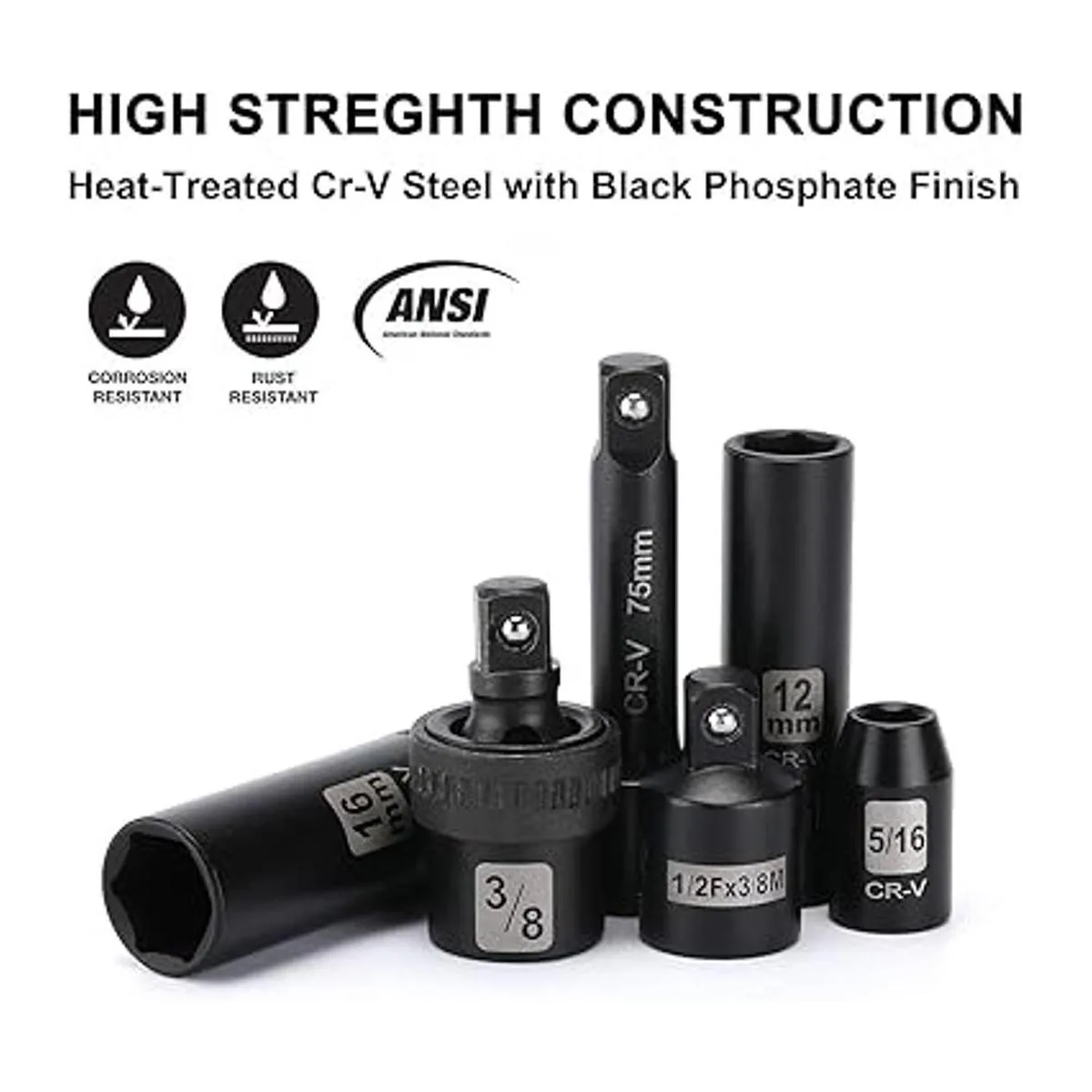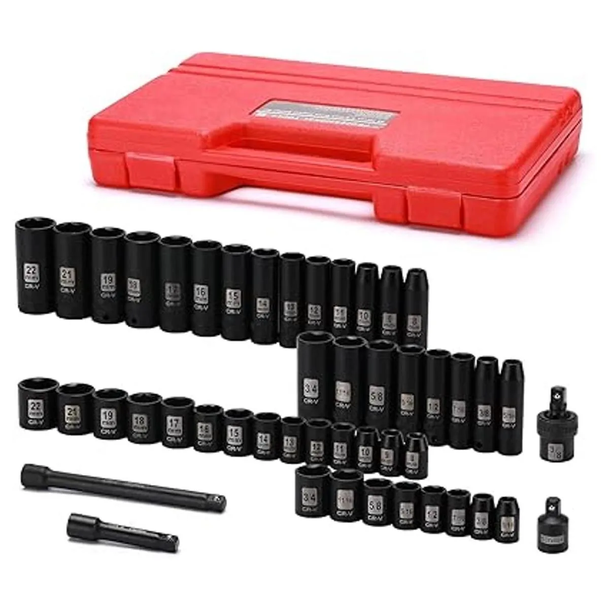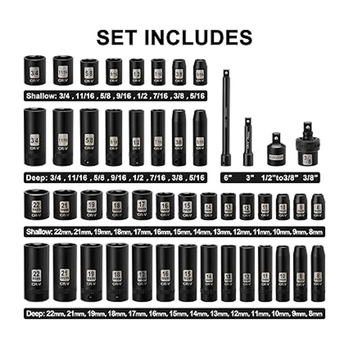 Mayouko Juego de 48 llaves de impacto de accionamiento de 38 pulgadas, SAEmétrico, 6 puntos, CRV, incluye barra de extensión, adaptador, junta universal