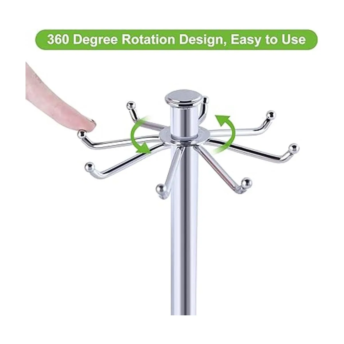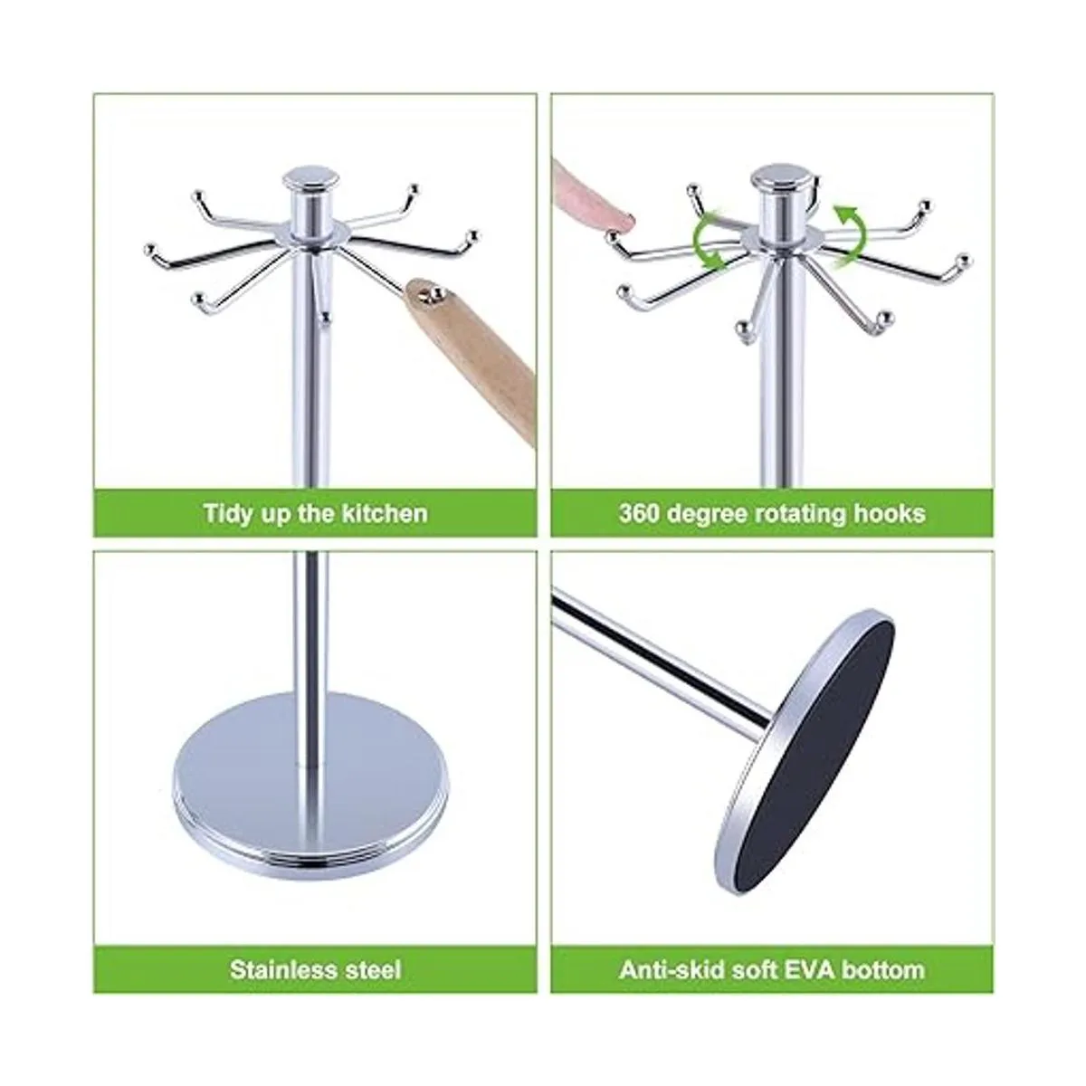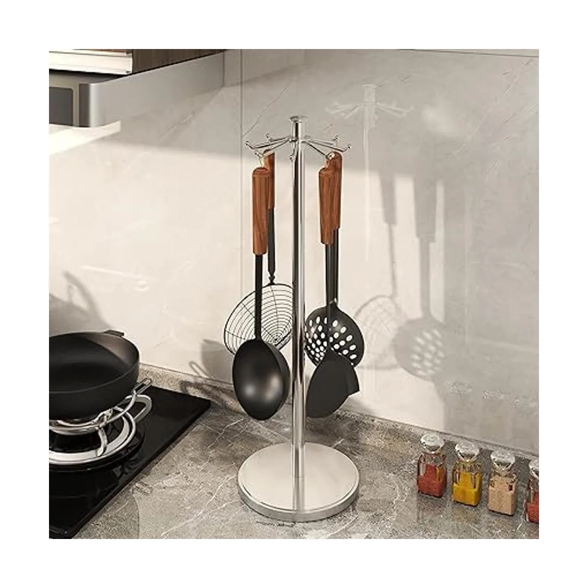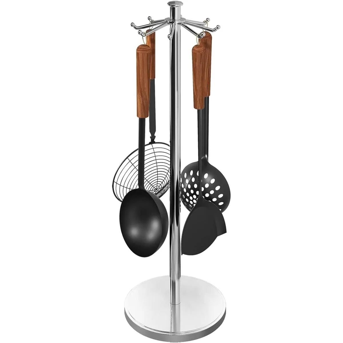MAYZOLOP Soporte para utensilios de cocina de acero inoxidable con 8 ganchos giratorios, organizador colgante para cuchara, espátula, cucharón de sopa, servidor de espagueti, espuma, cromo