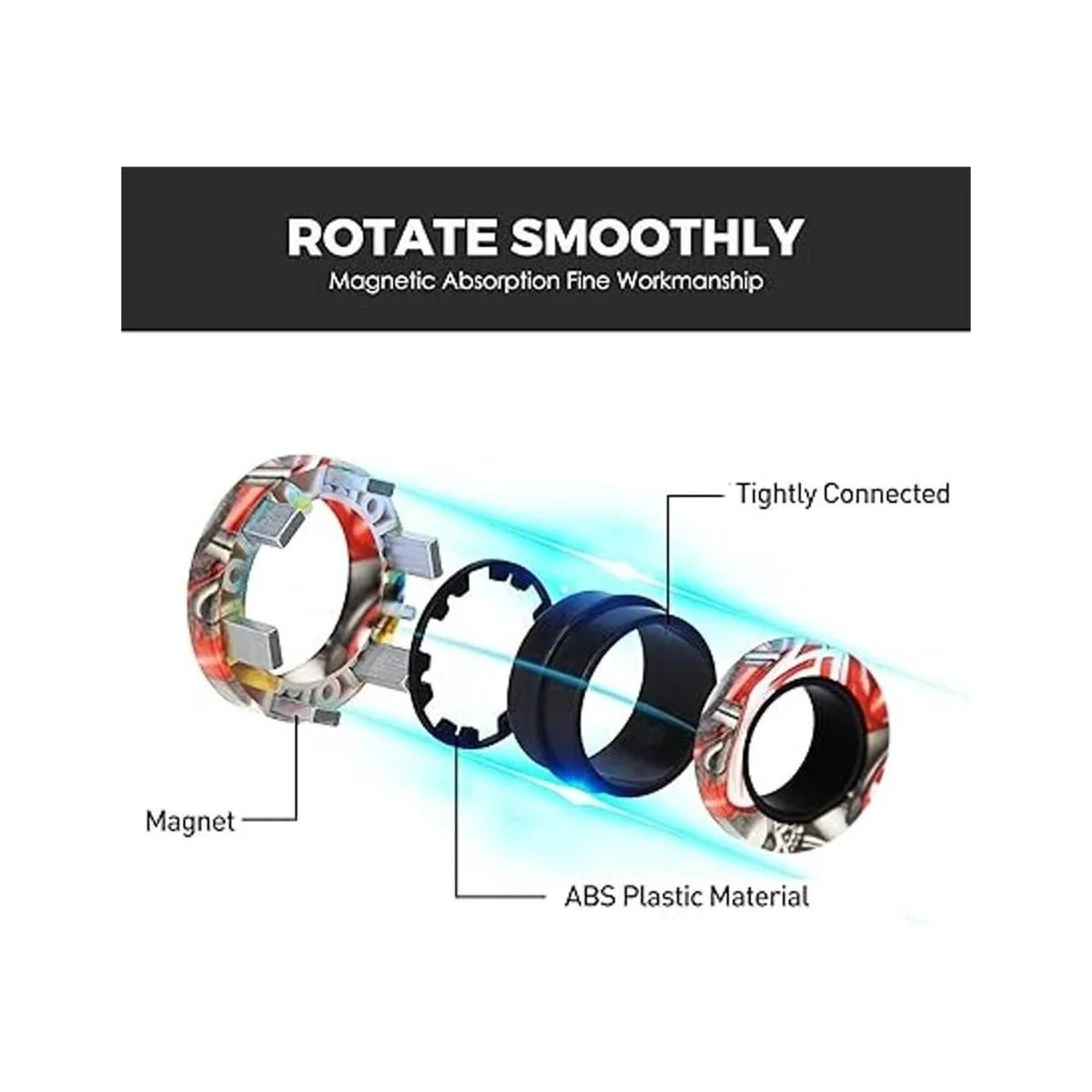 Los juguetes de anillo mágico son fáciles de jugar Sujeta con un dedo en cada lado del centro y luego gira con la otra mano. Con la práctica, los spinners se pueden utilizar con una sola mano. Para girar sobre una mesa, simplemente presiona el centro para mantenerlo estable y gira al mismo tiempo. Los juguetes para ansiedad seguirán girando una vez que te sueltes ir, y el tiempo de giro dura de 30 a 1 minuto. Juguetes mágicos de anillo hechos de plástico de grado ABS, cómodo y estable, no se deforma fácilmente, agarre ergonómico, sensación cómoda al tacto.