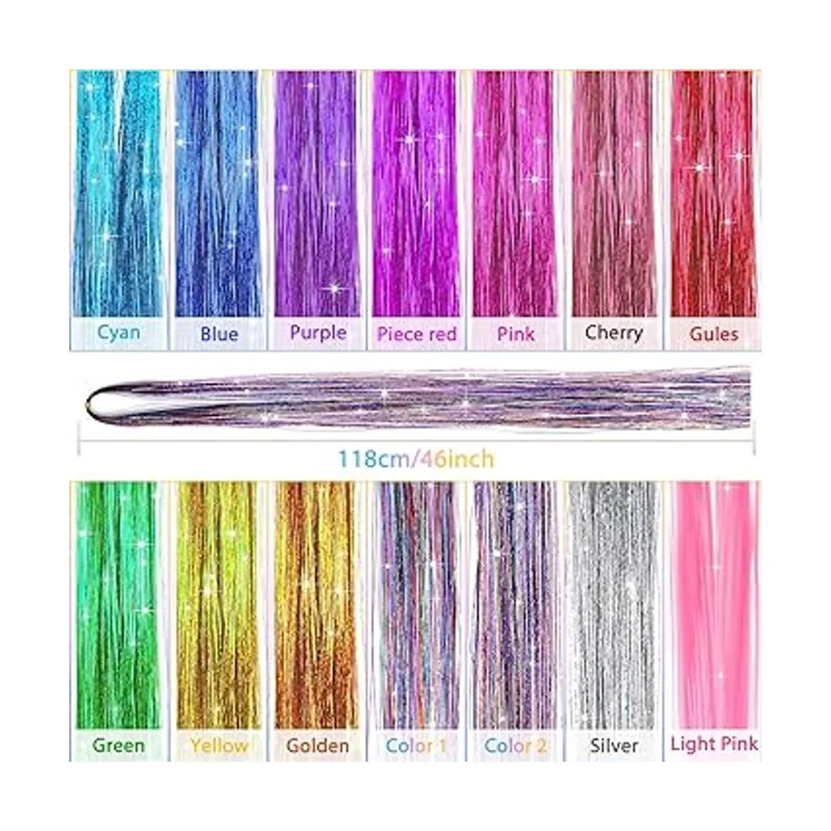 14 Kinds of Shiny Colors This hair extension tinsel set can provide you with more colors than other sets in the market, including sapphire blue, sky blue, red, pink, peach pink, bronze, champagne, silver, colorful, multicolored, plum red, dark purple, light purple, grass green. A variety of colors are matched with various styles of fairy hair to create a charming and eyecatching effect. Can also meet your needs girls and womens fashion pursuits show your elegance and confidence.