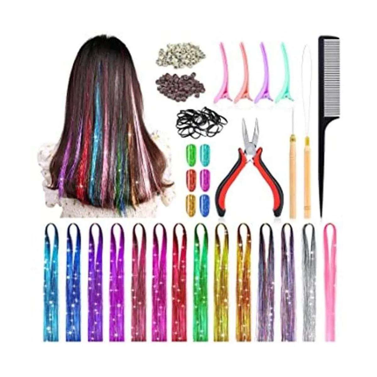 What You Get 14 colors hair extension tinsel set, 2800 strands of hair extensions, 200 strands in each color, 1crochet hook, 1tweezers, 1threader, 200pcs twocolor micro silicone ring beads brown100, Beige100, 4plastic alligator hair clips random color, 1black pointed comb, 1storage bag, 1 pack of black rubber bands. Different package options contain different products and number of accessories,Please select the kit you need carefully, thanks for your cooperation