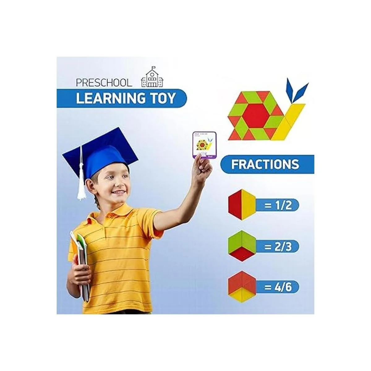 Fomentar la creatividad: los bloques de parquetería ayudan a los niños a aprender manipuladores matemáticos fraccionarios, mejorar la coordinación ojomano, la forma y el reconocimiento de color. También mejora las habilidades de resolución de problemas y memoria motora