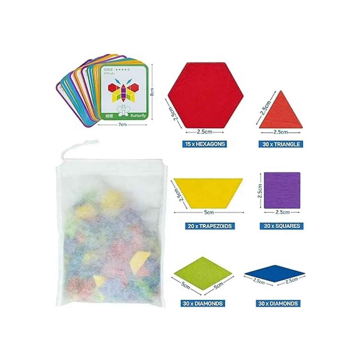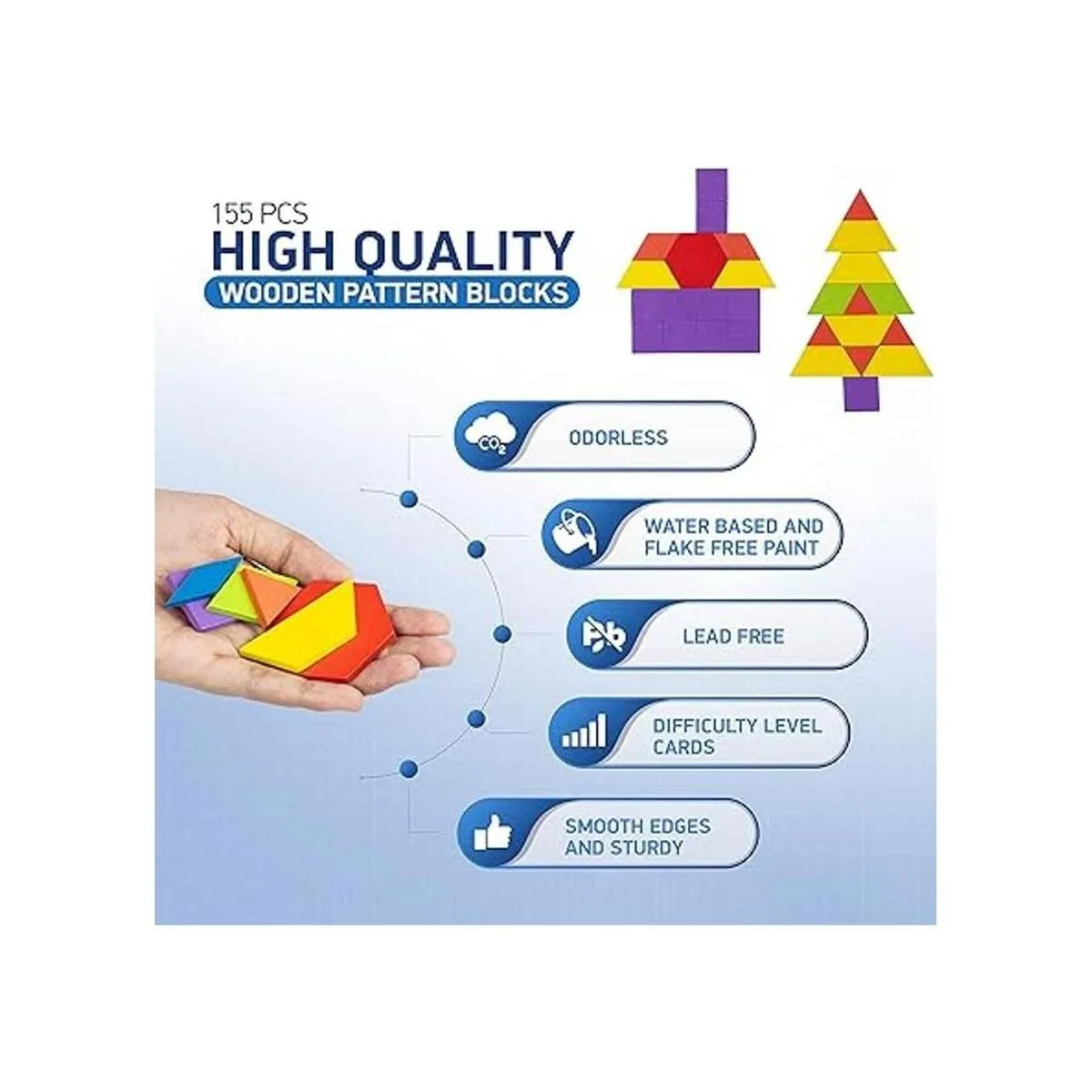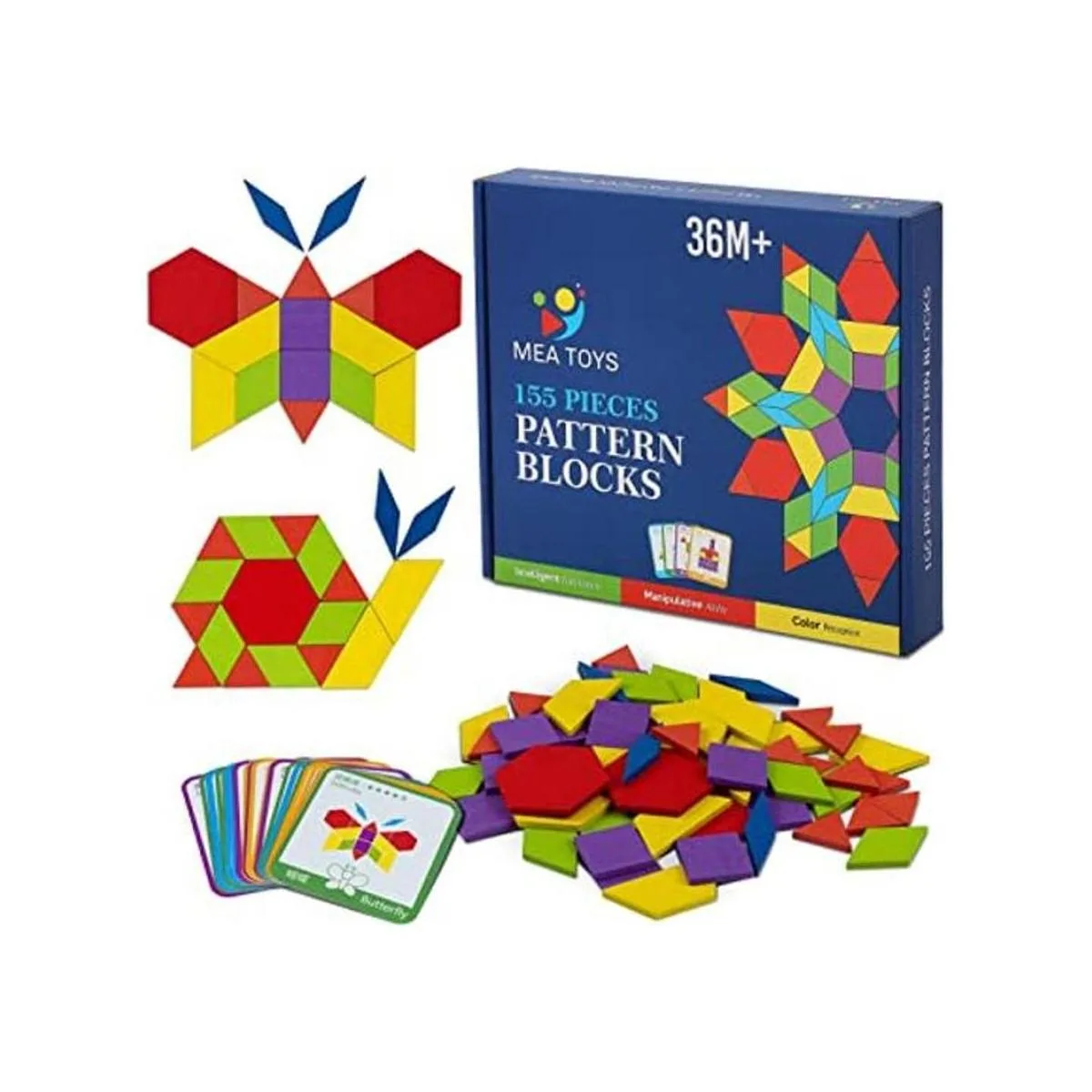 MEA TOYS 155 bloques de patrón de madera con 24 tarjetas de diseño, juguetes para niños de 3 a 8 años, tangramas gruesos multicolores, rompecabezas de forma geométrica para el aprendizaje de niños de jardín de infantes