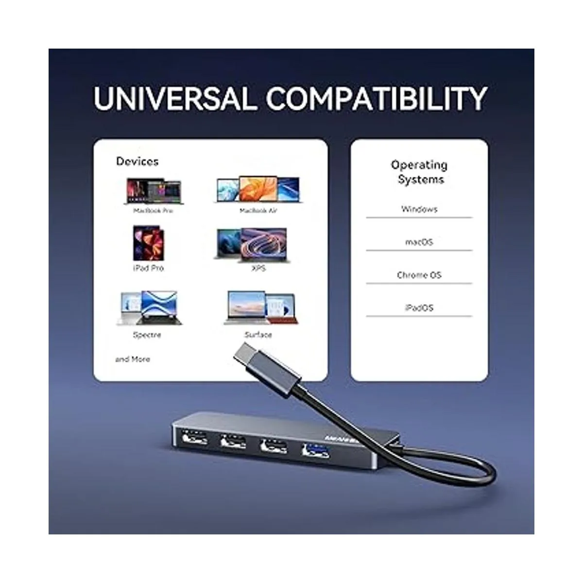 Amplia compatibilidad: hub USB C con 4 puertos compatible con iMac, MacBook, MacBook Air, Mac Pro/Mini, Surface Pro, XPS, Notebook, PC, Windows 10/8/8. 1/7/ Vista/XP y Mac OS X, Linux y Chrome OS.