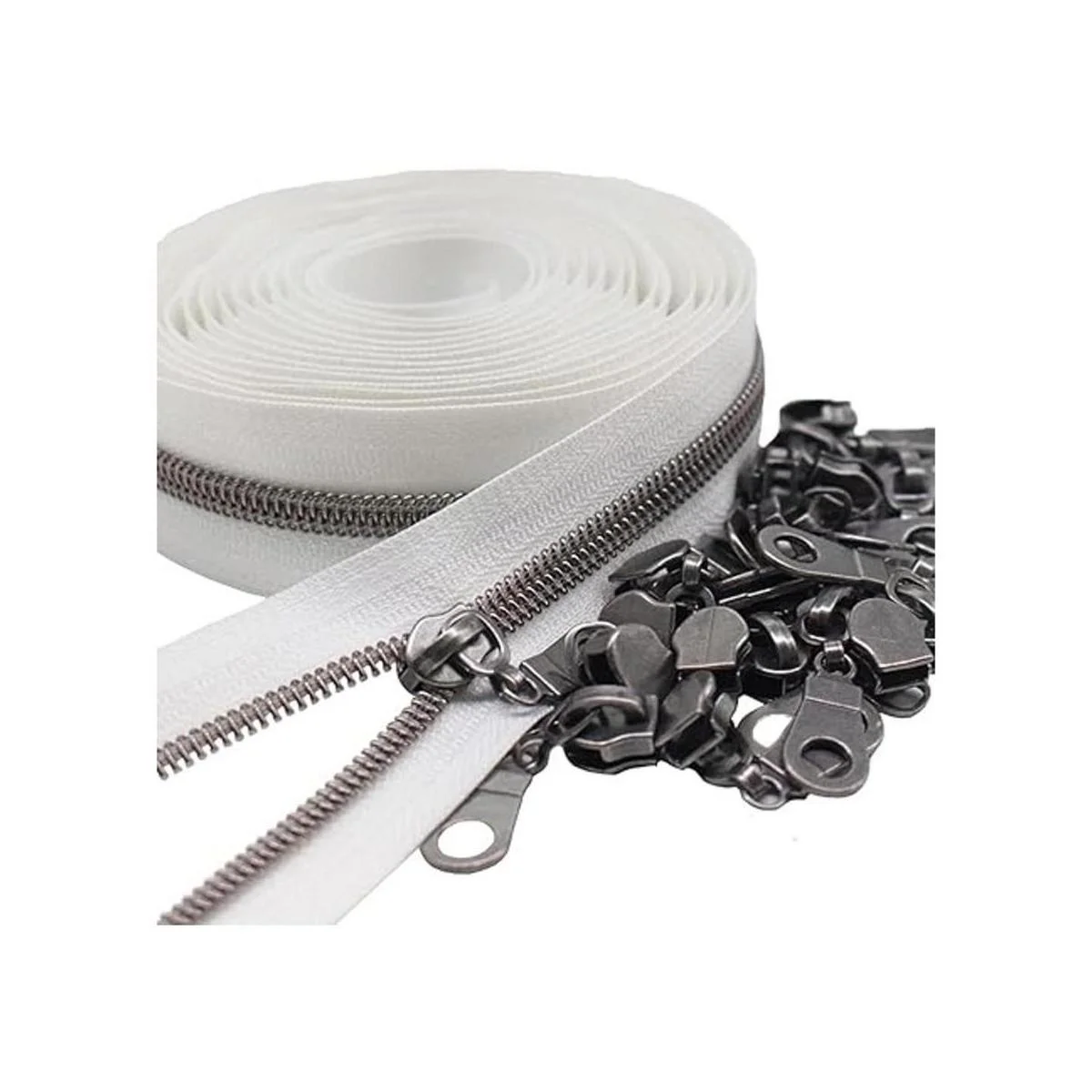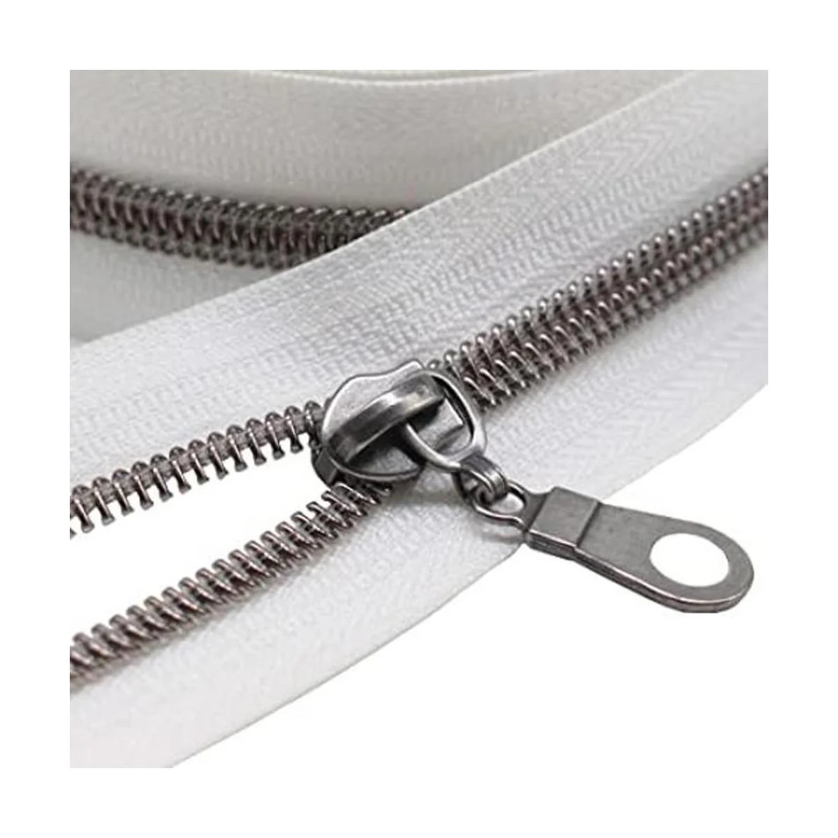 MebuZip The Yard Cremalleras de bobina de nailon metálico de metal 5 por The Yard con bobina a granel, 10 yardas con 25 tiradores para bolsas de manualidades de costura blanco