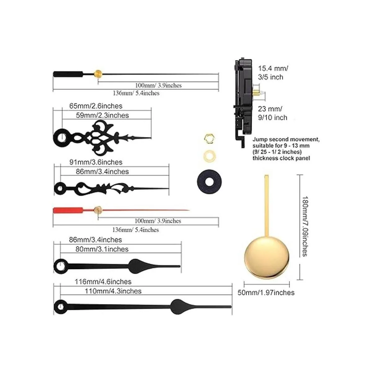 Mecanismo de reloj de péndulo: aprox. 0.906 in de longitud total del eje, 0.606 in de longitud de rosca; segundo movimiento, adecuado para paneles de reloj de 9 a 0.512 in de grosor; comprueba el tamaño antes de comprar