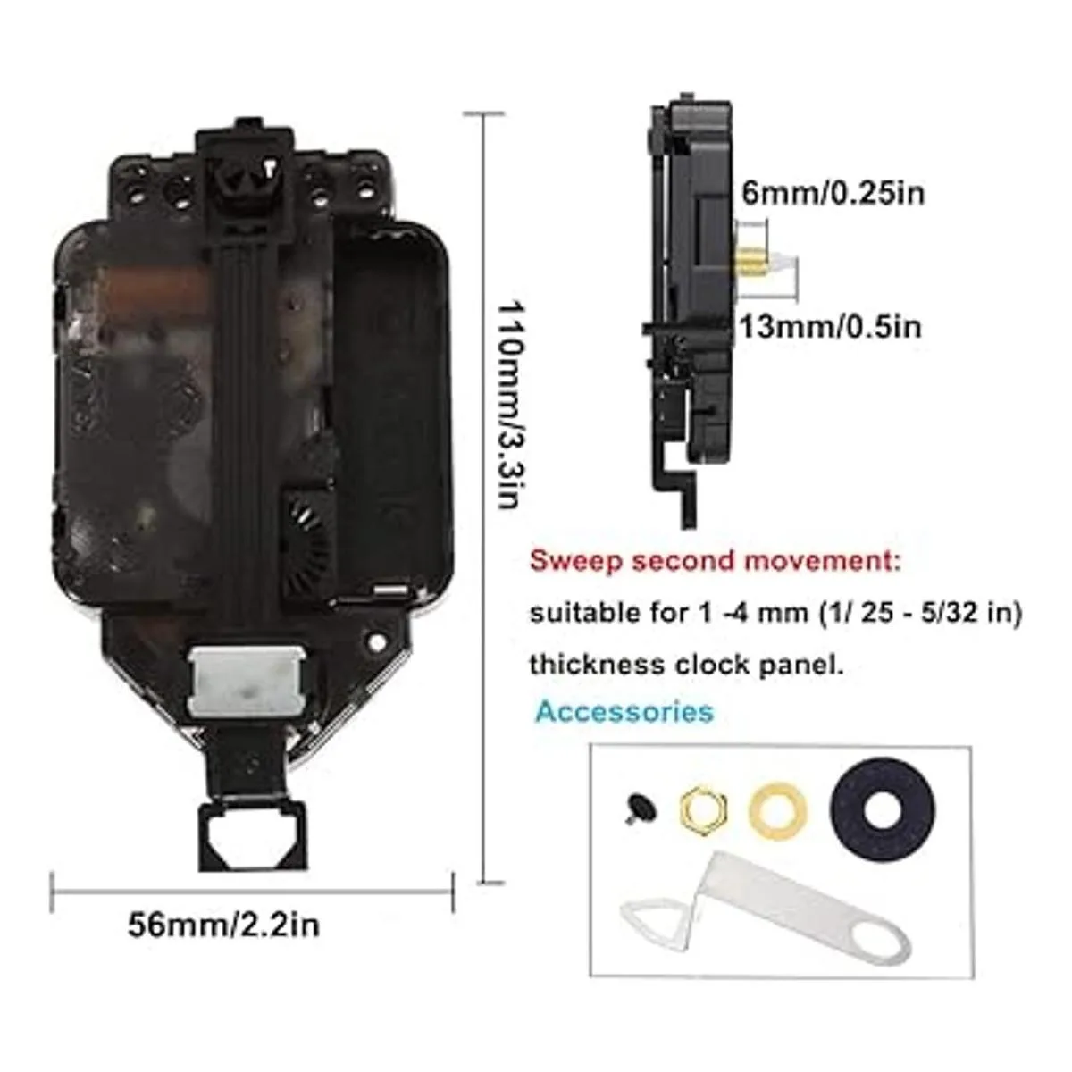 Control de tiempo preciso y motor silencioso: el tamaño total del eje es de 0.512 in, la longitud de la rosca es de 0.236 in; segundo movimiento de barrido, adecuado para panel de reloj de 1 a 0.157 in de grosor. Cuenta con mecanismo de reloj de alta precisión, que ofrece precisión y fiabilidad del relojero; equipado con movimiento de barrido, sin tictac; alimentado por una batería AA.