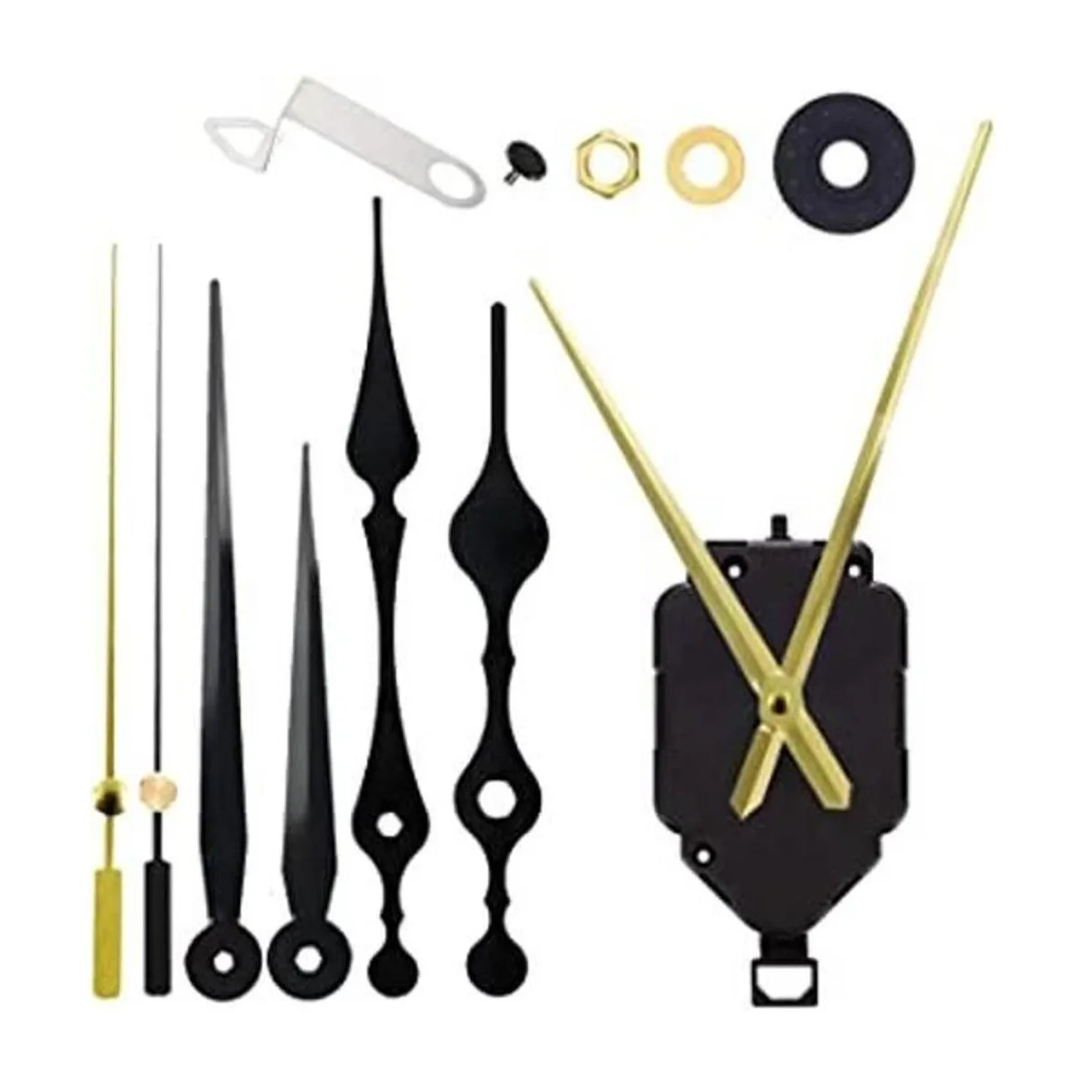 Movimiento de reloj de péndulo de alto par con gancho de metal: el juego de movimiento de reloj de péndulo viene con 3 pares de manecillas largas, palas, elegantes, rectos 2 negros y 1dorados. Bueno para reparar, reemplazar o hacer un reloj por ti mismo. El movimiento de reloj de estilo simple puede combinar con diversos colores, patrones, formas de panel de reloj, no destacará, buen movimiento funcionará bien.