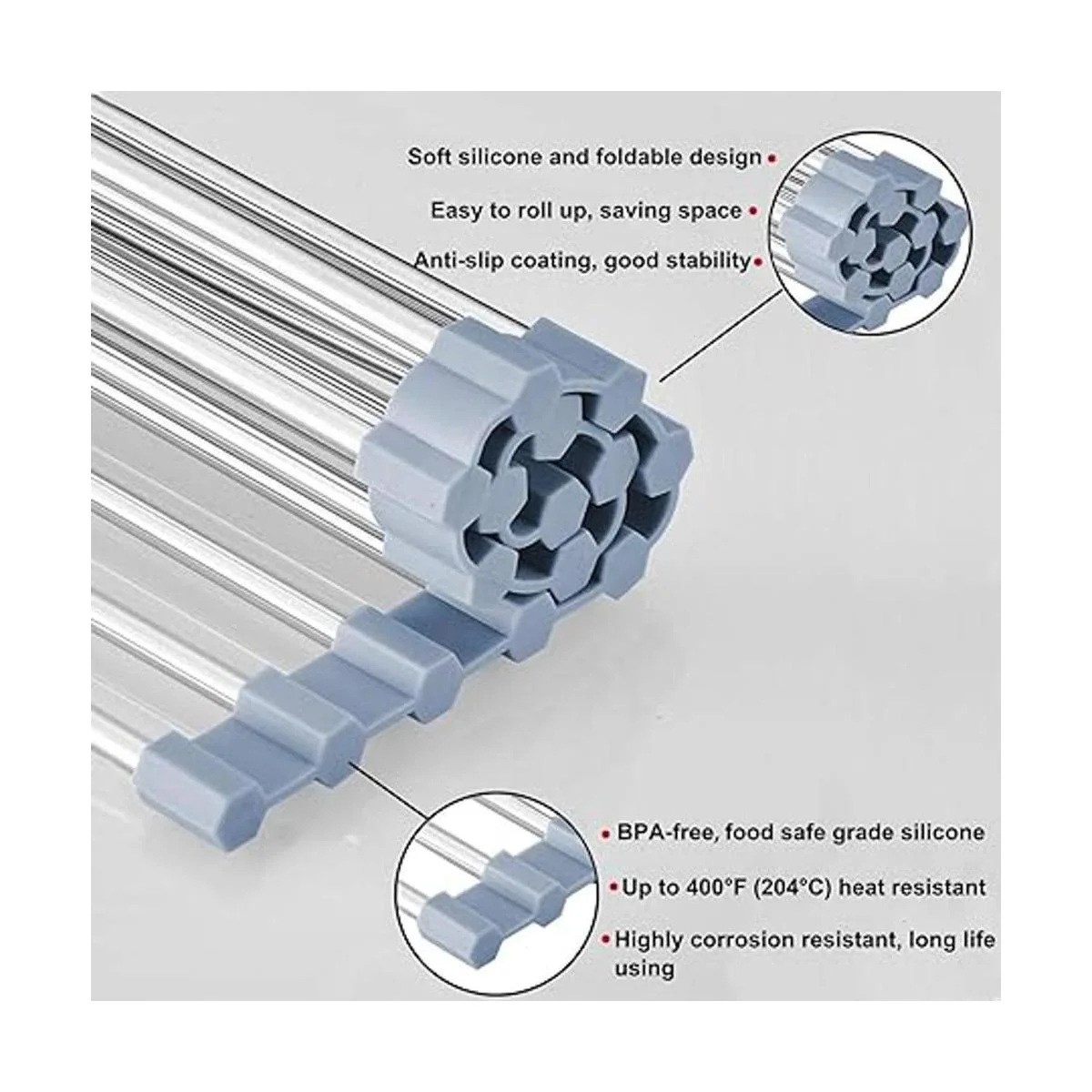 Diseño enrollable: silicona suave y diseño plegable hacen que el escurridor sea fácil de desplegar para usar, se enrolla para almacenar cuando no está en uso, ahorra espacio, y también es fácil de limpiar y secar. Ocupa poco espacio, pero puede hacer que tu vida en la cocina sea más cómoda.