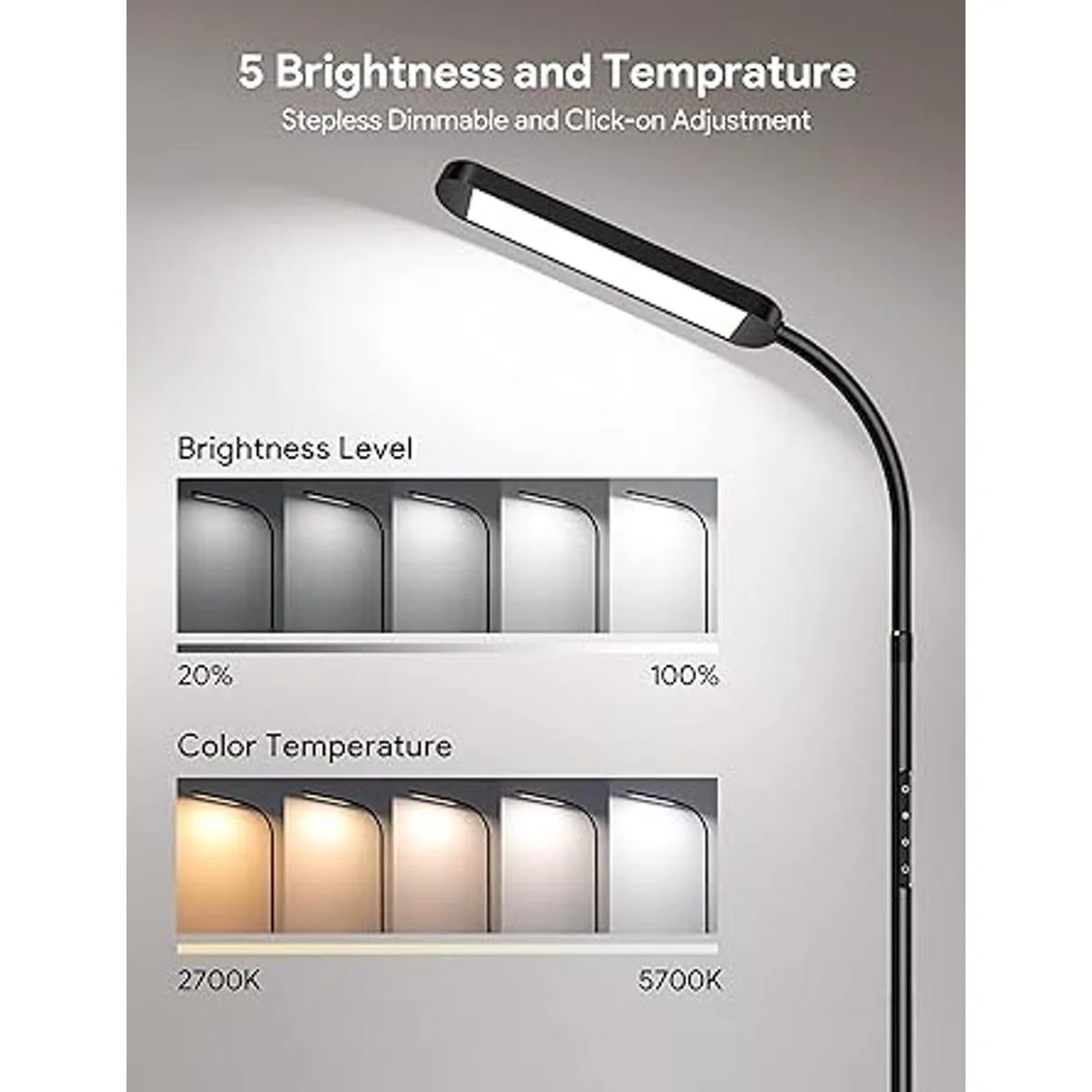 5 brillos y 5 colores para proteger los ojos: la lámpara de pie MediAcous tiene 5 niveles de brillo 20100 y 5 temperaturas de color 2700 K5700 K para elegir, personaliza fácilmente tu experiencia de iluminación. Regulable continuo y ajuste de grifo de dedo están disponibles. La lámpara de pie LED tiene suficiente brillo, mientras que la luz es suave y sin parpadeo, protegiendo tus ojos