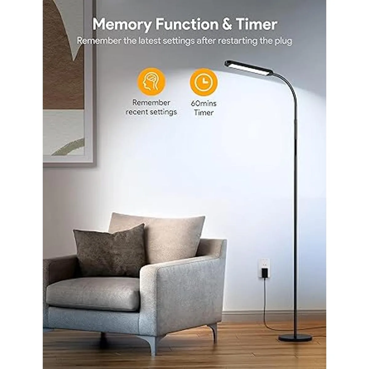 Temporización, memoria y enchufe de pared disponible: la función de temporizador de 1 hora de esta moderna lámpara de pie te recuerda tomar un descanso a tiempo, bueno para tus ojos. Esta lámpara de pie regulable también se puede utilizar como luz nocturna. Cuando se utiliza el enchufe de pared en lugar del control remoto o táctil interruptor para apagar la lámpara, la función de memoria te permite encender las luces con un botón mientras mantiene los últimos ajustes de uso