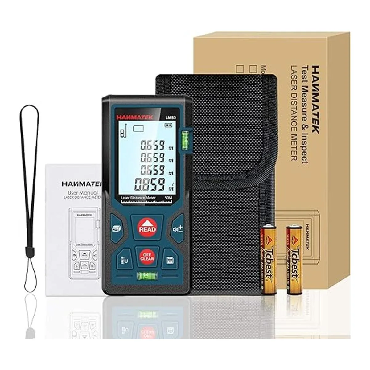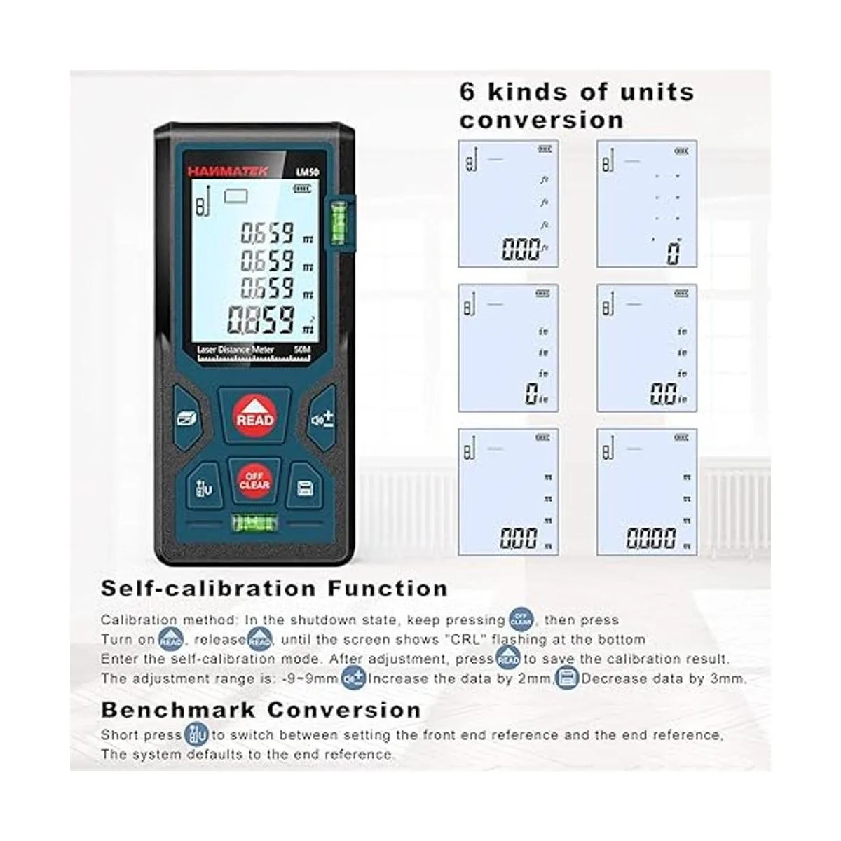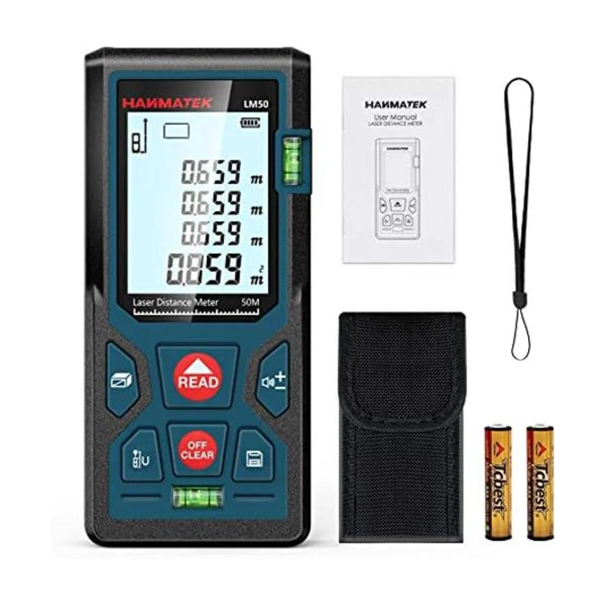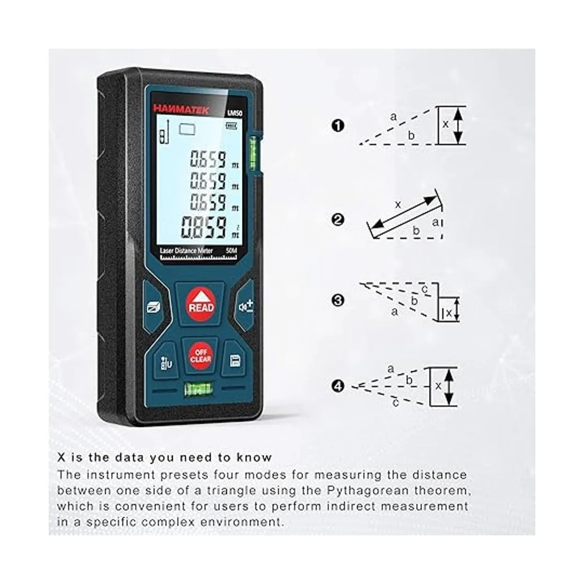 Medición láser de 165 pies164.0 ft FtinM de conmutación LM50 dispositivos de herramienta de medición láser con 2 niveles de burbuja, LCD retroiluminado grande