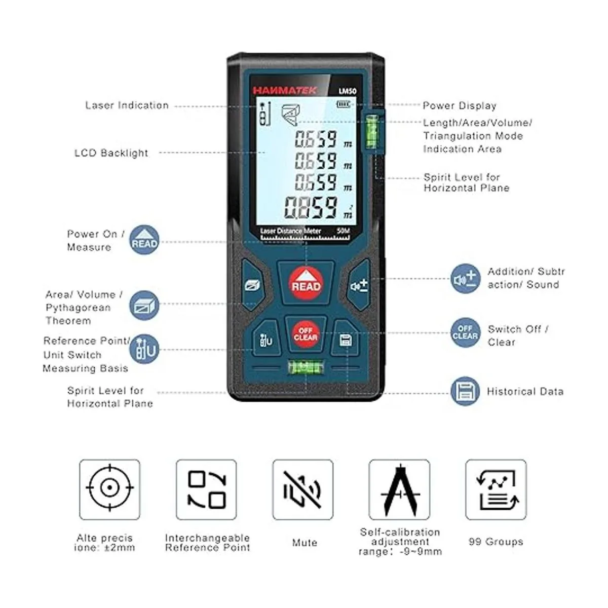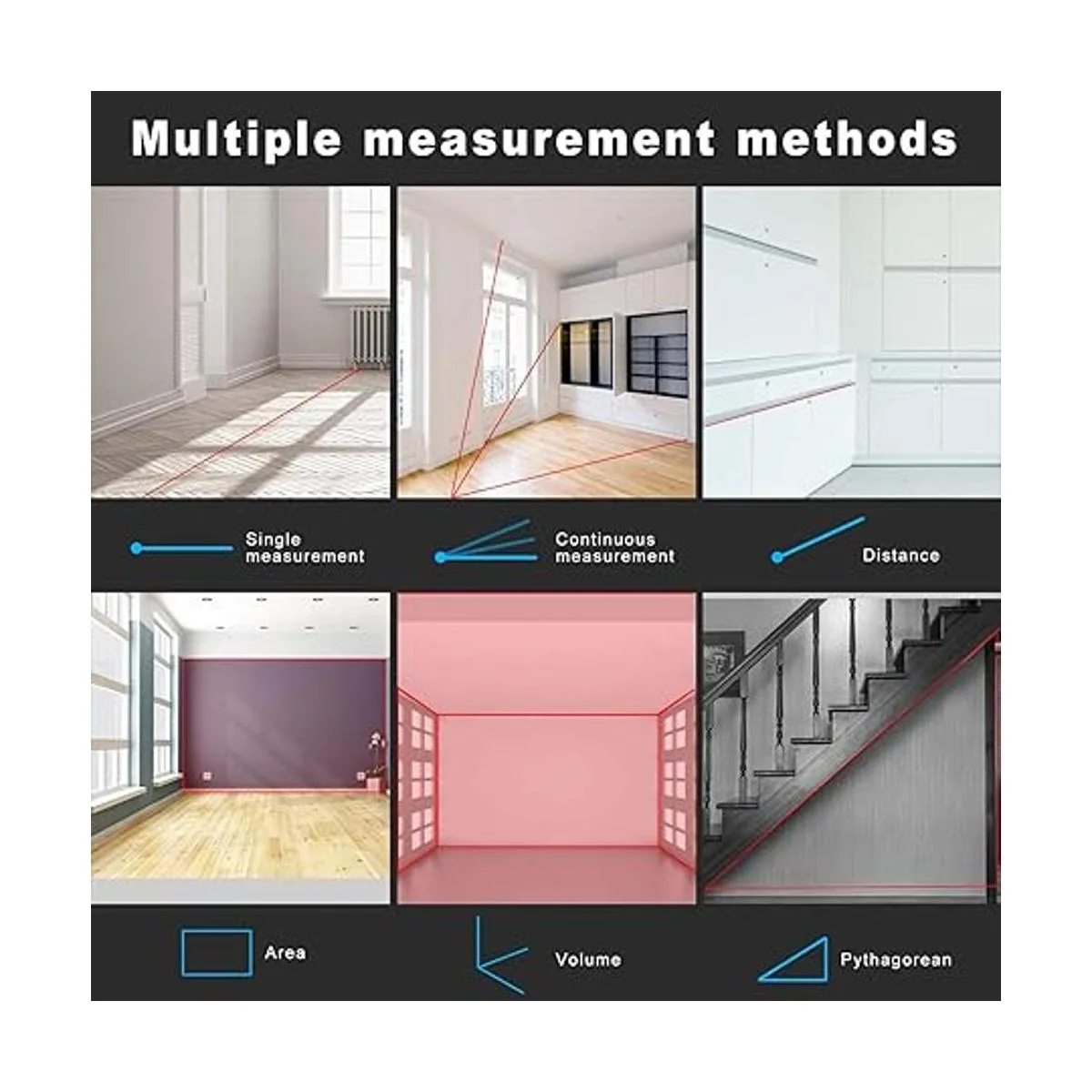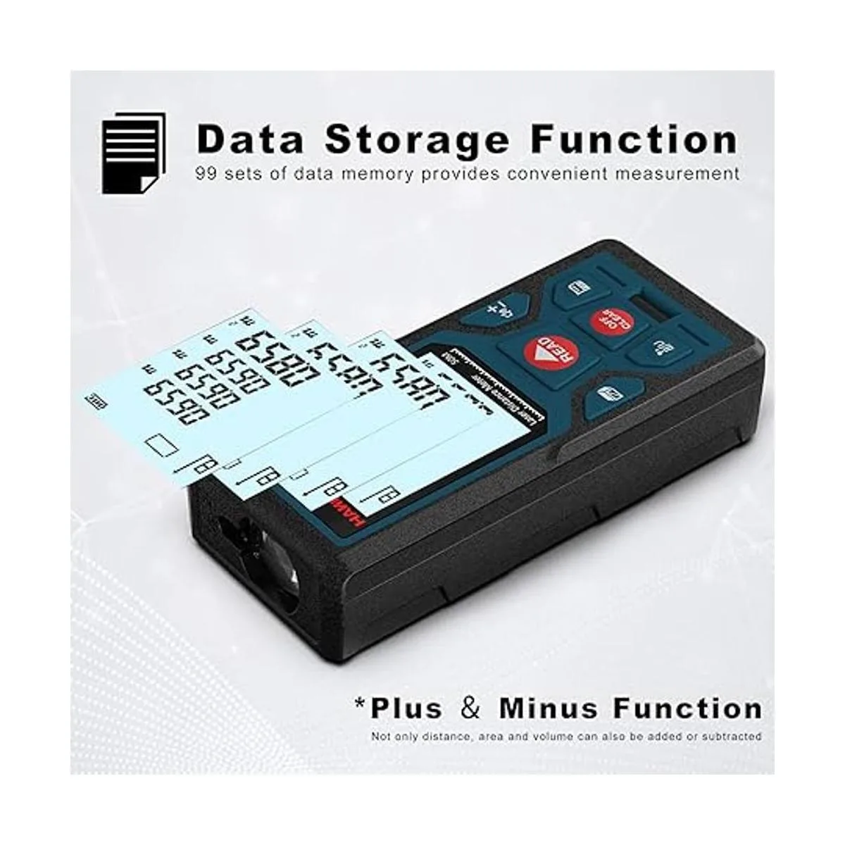 Múltiples funciones de medición: área, distancia, longitud, volumen, medición continua, método de pitágórico tres puntos; suma y resta; indicador de batería baja; 99 grupos de memoria de datos; elimina los datos manualmente; apagado automático después de 150 segundos sin funcionamiento para ahorrar electricidad.