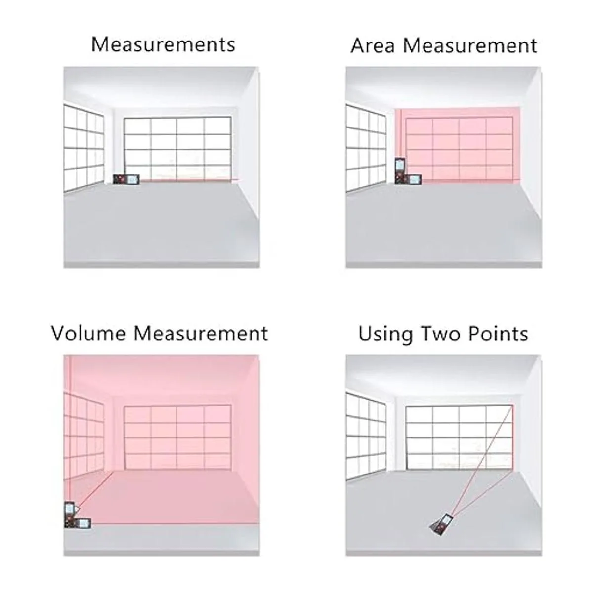 Funciones de extensión: con este medidor de distancia portátil puedes configurar fácilmente en metros/pulgadas/pie. Se pueden guardar y recuperar hasta 20 registros. La herramienta también tiene el botón de silencio, y las funciones de añadir/restar mediciones y autocalibración