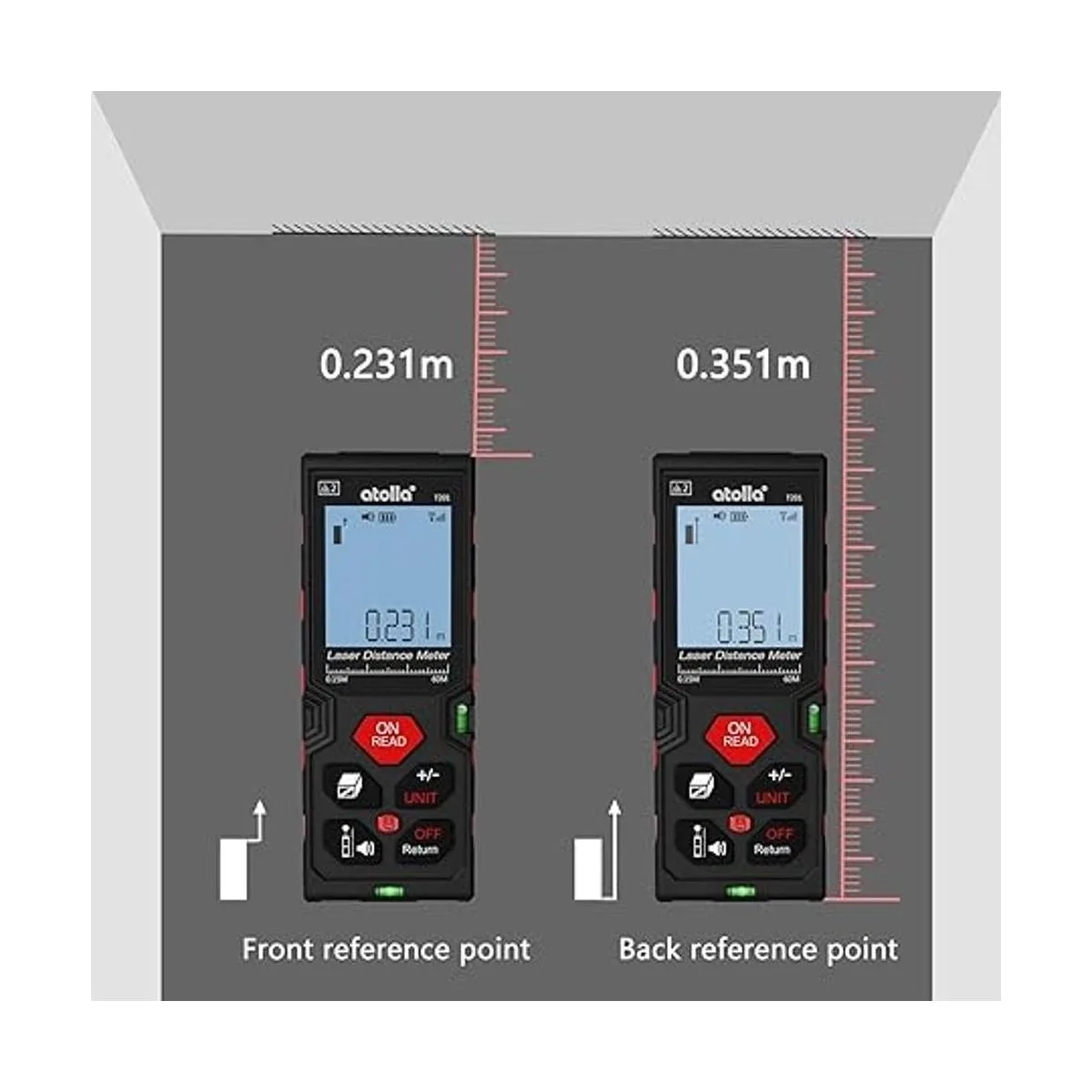 Medición láser, medidor de distancia láser atolla 196 pies Mpulgadapie hasta 196.9 ft 0.079 in de precisión con función de silencio, IP54 impermeable, nivel de burbuja, retroiluminación LCD para modo pitagórico, distancia de medición, área, volumen