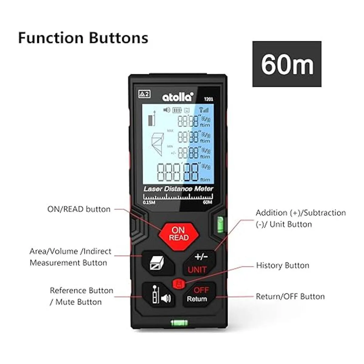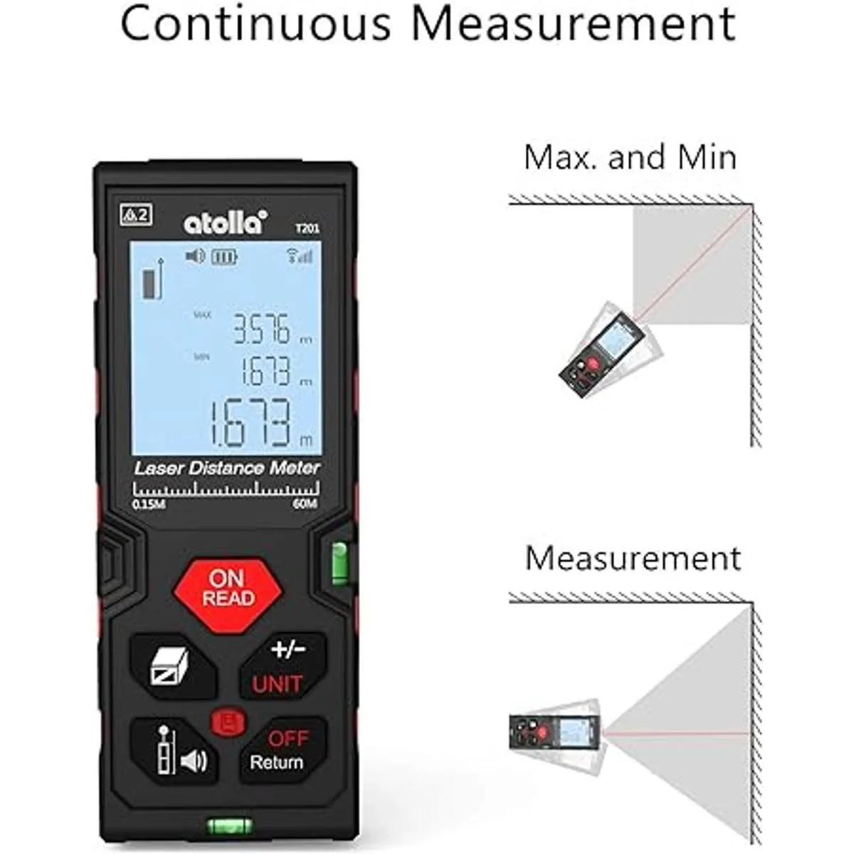Varios modos de medición de 0,15 a 196.9 ft: la herramienta de medición láser de atolla es una herramienta de medición avanzada para medición en interiores, así como para obras de construcción al aire libre, que tiene diferentes modos de medición, incluyendo medición única, medición continua con función mínima/máximo, medición de área/volumen y medición de pitágoras. La herramienta de medición láser atolla es un producto láser de clase II con salida de potencia de menos de 1 mW. El rango de medición cubre de 0,15 a 196.9 ft