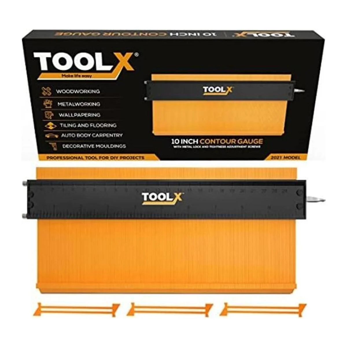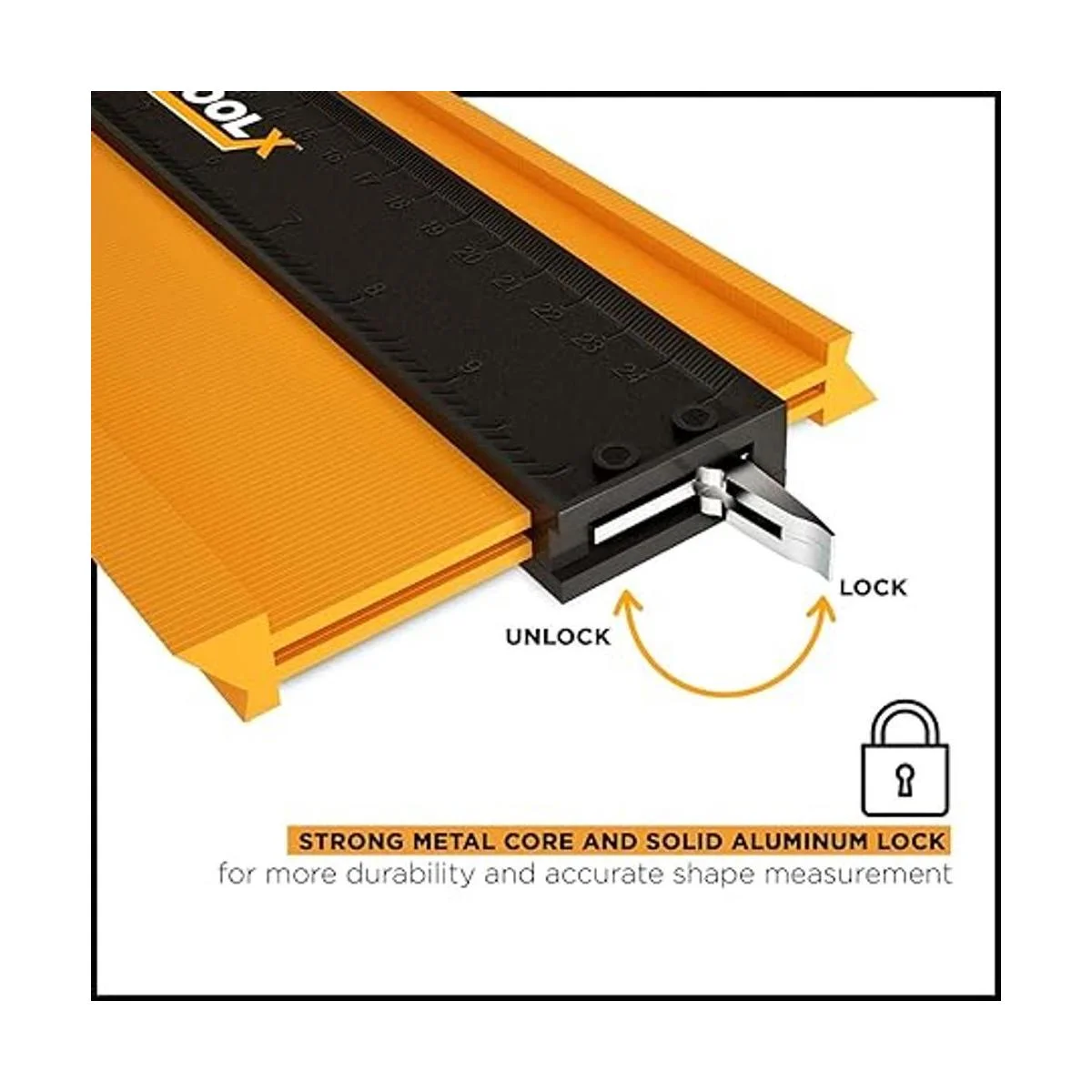 Sistema de bloqueo de metal: el aluminio más fino se utiliza en medidor de contorno con bloqueo para una calidad sólida de construcción. Puedes tomar fácilmente medidas precisas de contornos, esquinas, bordes para un acabado suave y un ajuste perfecto.