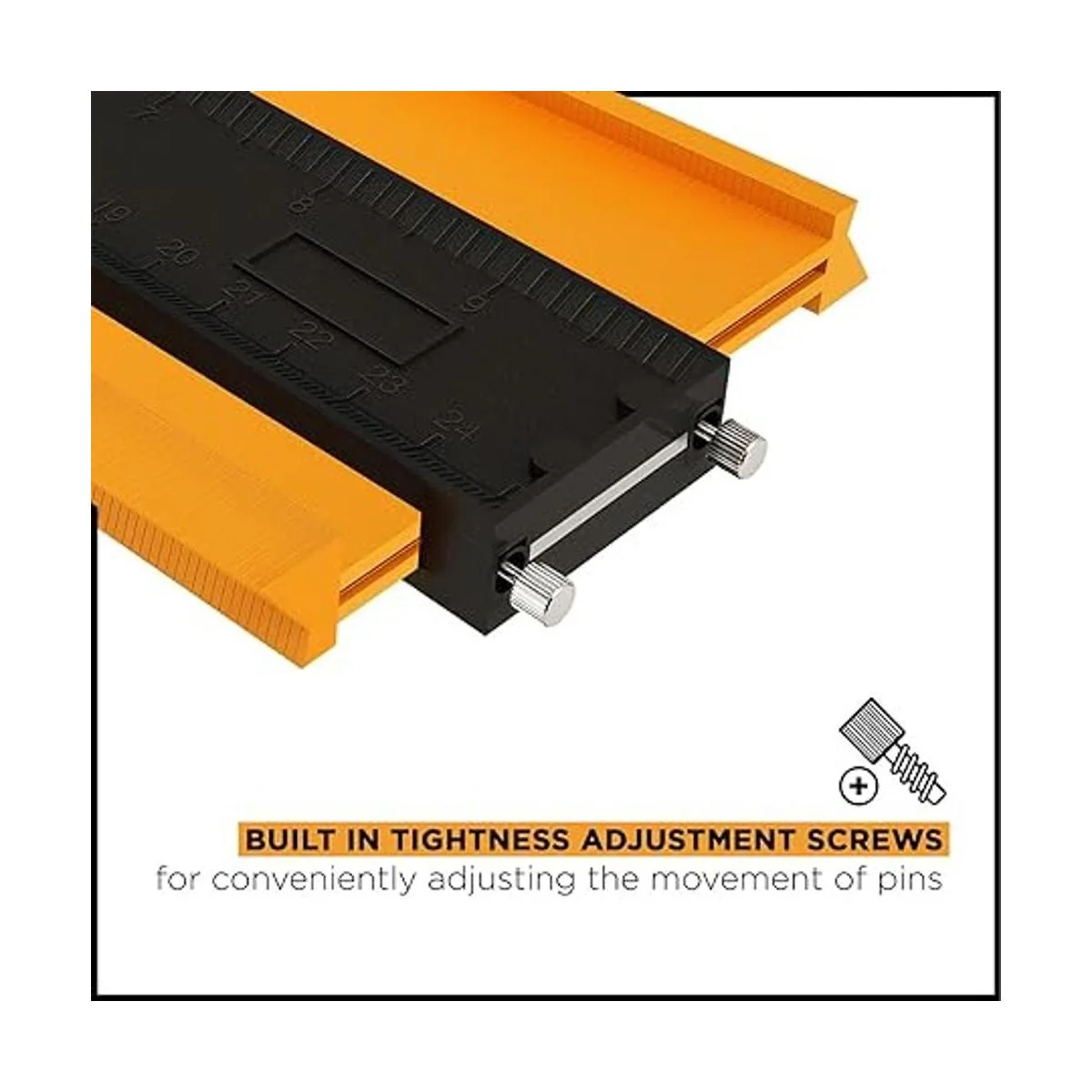 Tornillos de ajuste de tensión de pines: con tornillos integrados en nuestro medidor duplicador de contorno, puedes ajustar fácilmente la tensión de los pines según tus necesidades. No hay necesidad de elegir otros medidores de perfil caros que vienen con una llave Allen que es difícil de usar y almacenar