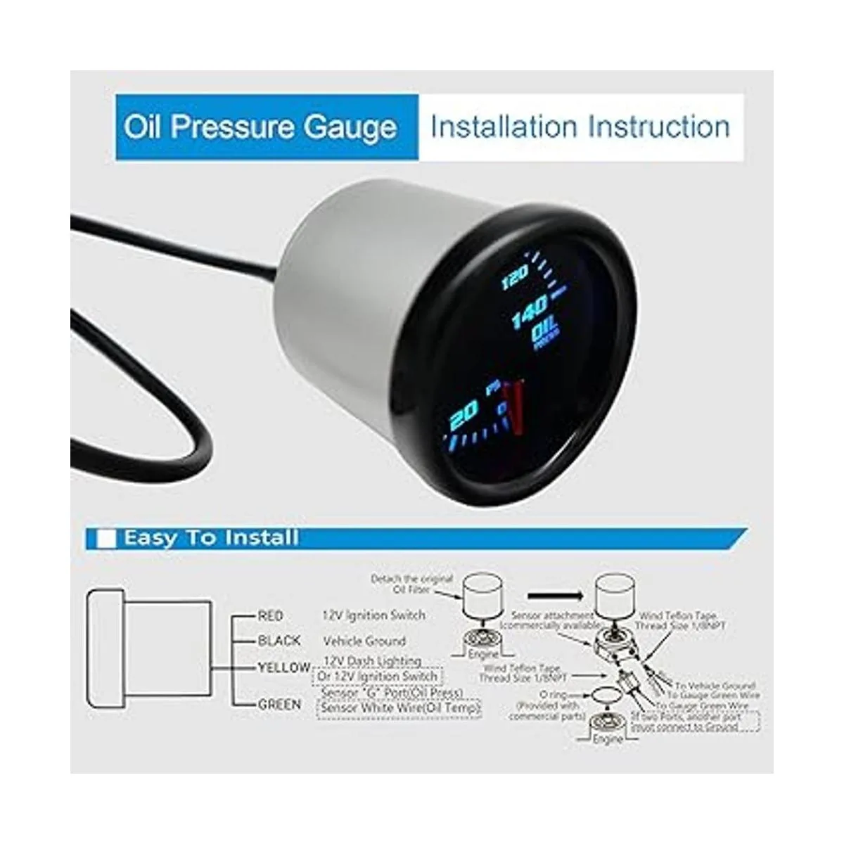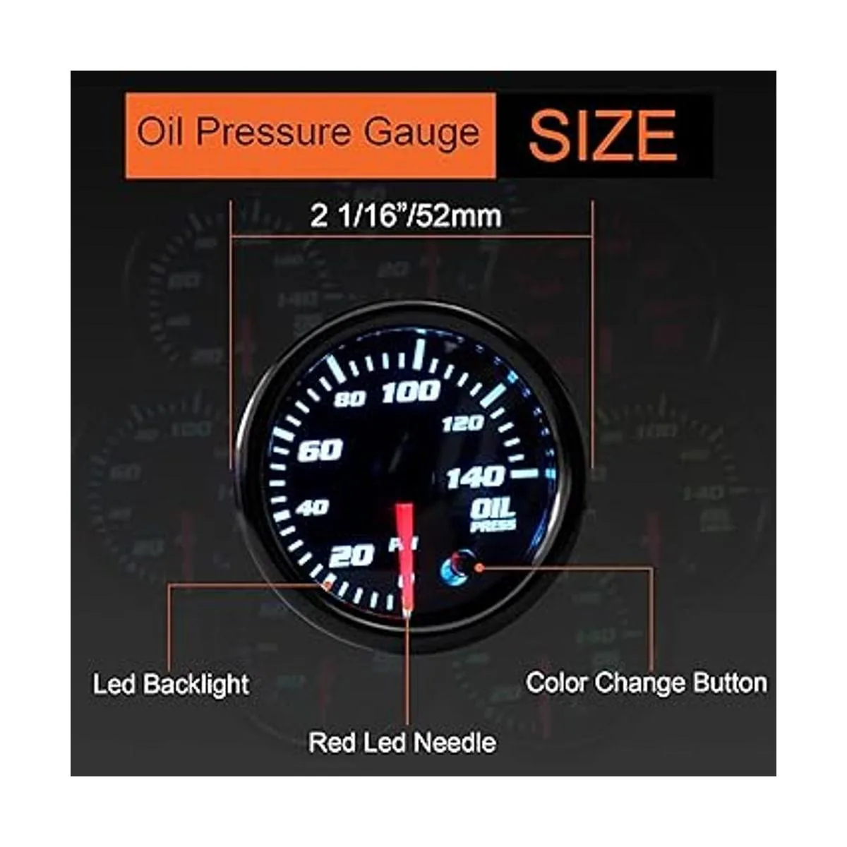 Lecturas de presión de aceite de 0 a 140 PSI 21/16 pulgadas 2.047 in, lente tintada y aguja roja iluminada añadirán un aspecto elegante y nuevo. Cuando entres en un oscurecimiento completo creará un aspecto sigiloso único y personalizado.