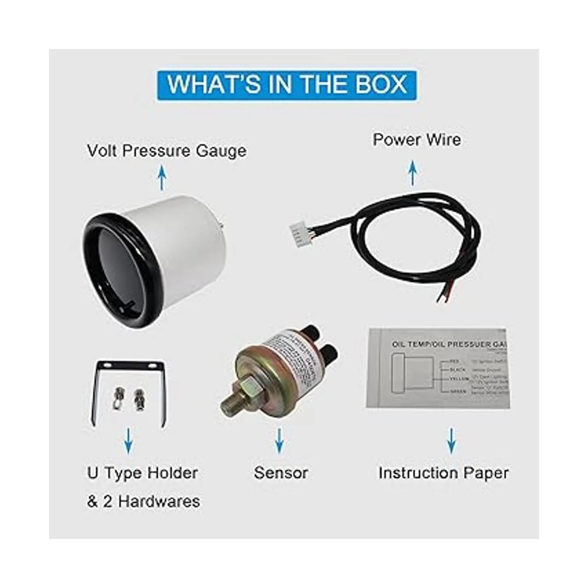 1 medidor de prensa de aceite, 1 sensor de prensa de aceite, 1 arnés de potencia, 1 papel de instrucciones idioma español no garantizado, 1 soporte en U, algunos accesorios