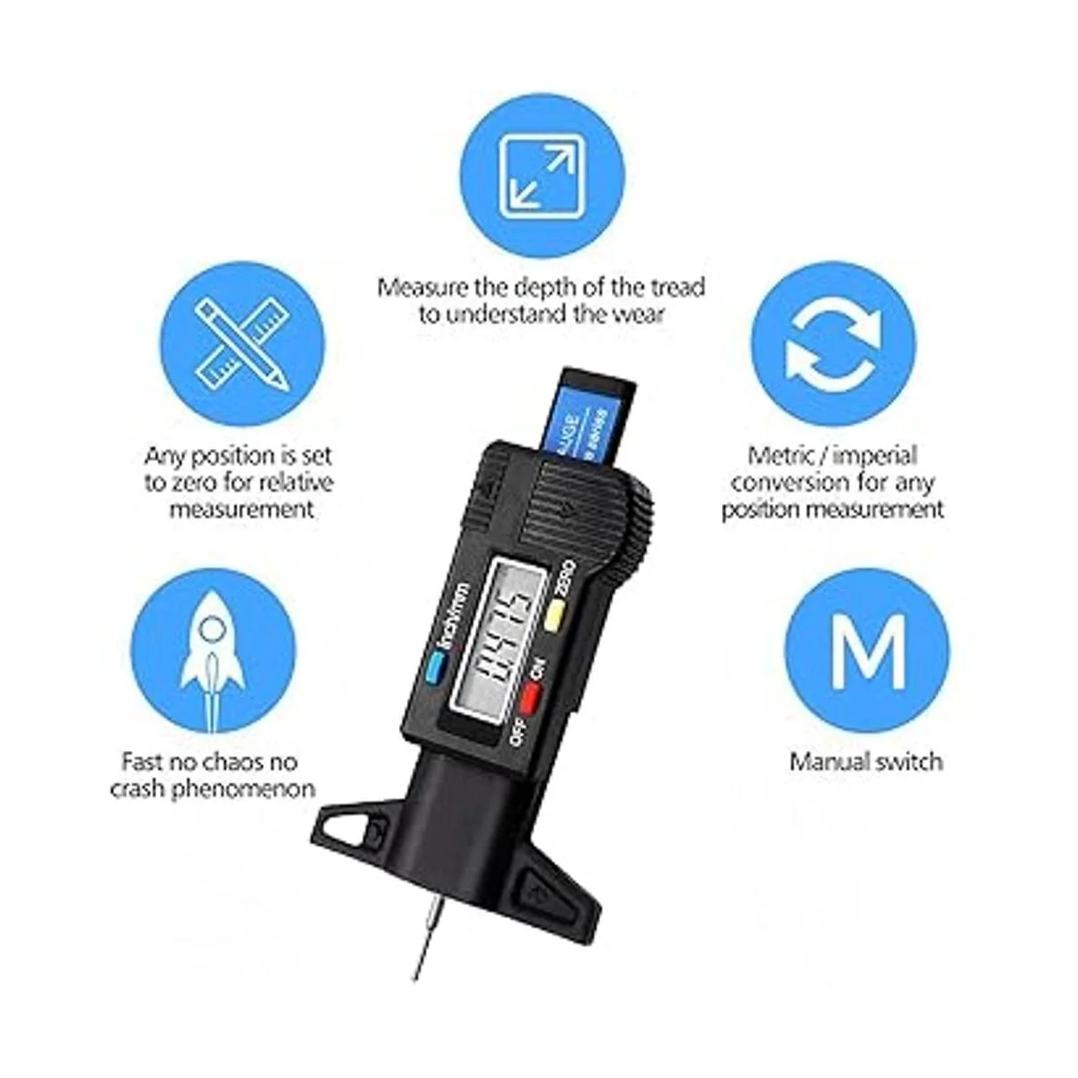 Medidor de profundidad de banda de rodadura de neumáticos, medidor de profundidad digital LCD con conversión de pulgadas y mm de 00.98 pulgadas, comprobador de neumáticos para coches, motocicletas, camiones, furgonetas, SUV, negro