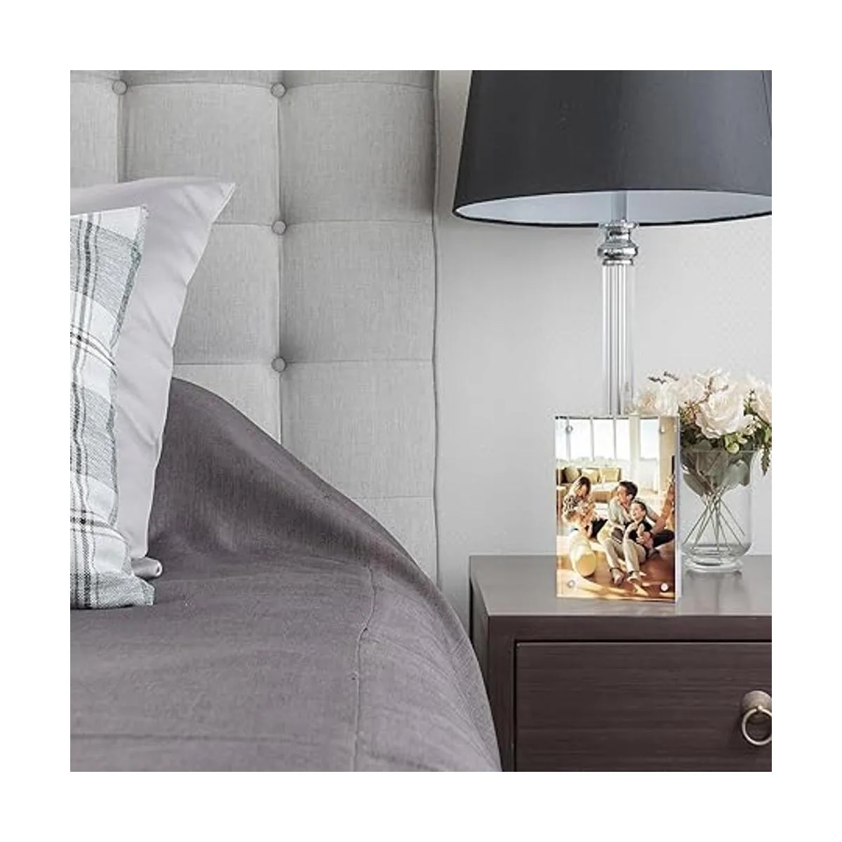Doble cara: diseño de doble cara que puede mostrar dos fotos de atrás a atrás o una imagen frontal y trasera. Se puede colocar en el escritorio horizontal o verticalmente, sin necesidad de un brazo de soporte que nunca se mantenga de pie y requiere espacio adicional para la exhibición. Una imagen de 5 x 7 pulgadas irá al borde del marco, tamaños más pequeños como fotos de 4 x 6 pulgadas dejarán un borde para un aspecto flotante