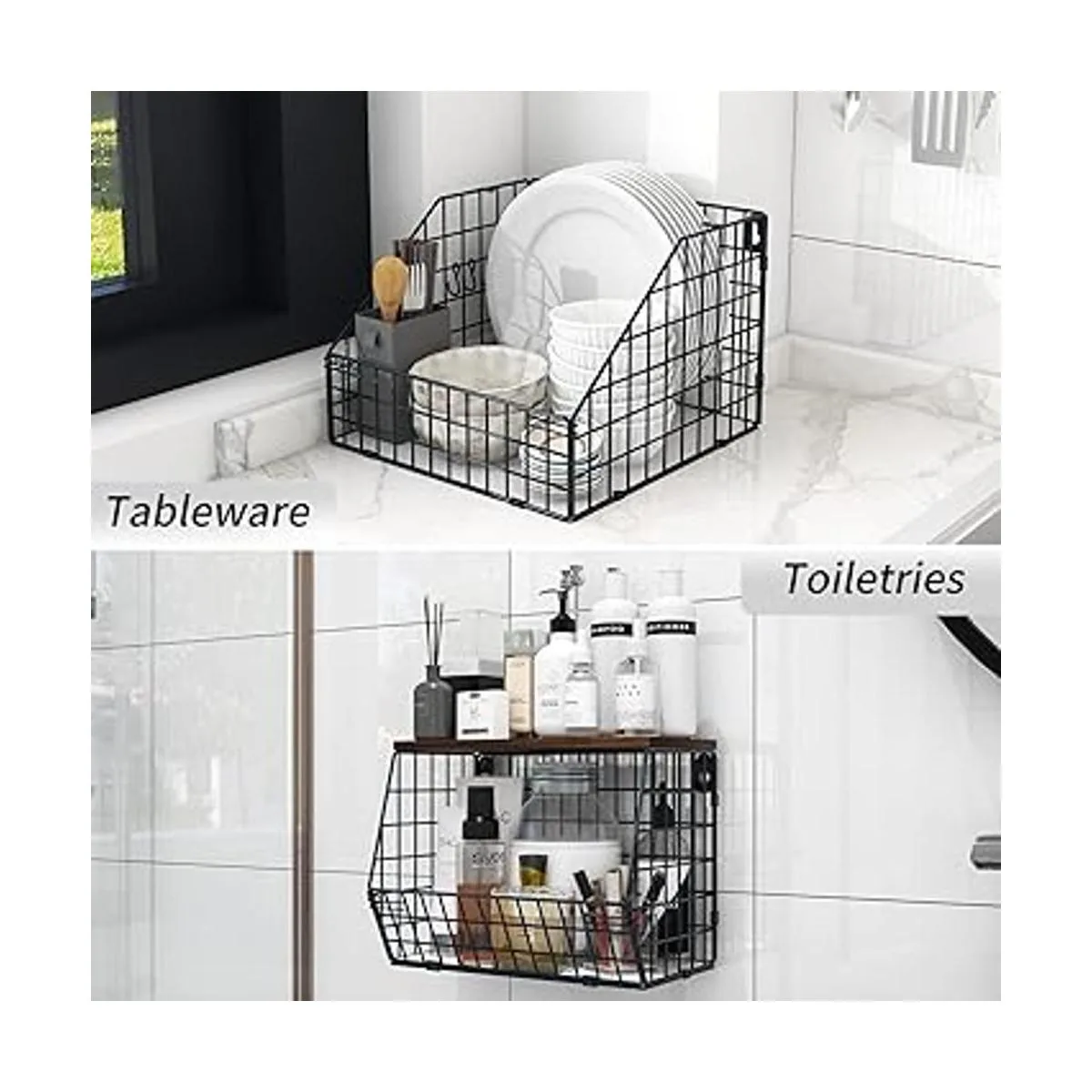 Cesta apilable y de alambre de pared: nuestro organizador de despensa no solo se puede apilar o usar en niveles de encimera, sino que también se puede colgar en la pared para maximizar tu espacio. Las cestas de almacenamiento con tapa de madera añaden más espacio de almacenamiento para poner algunas cosas pequeñas como tarros de condimentos, revistas, suministros de oficina, artículos de tocador para baño, etc