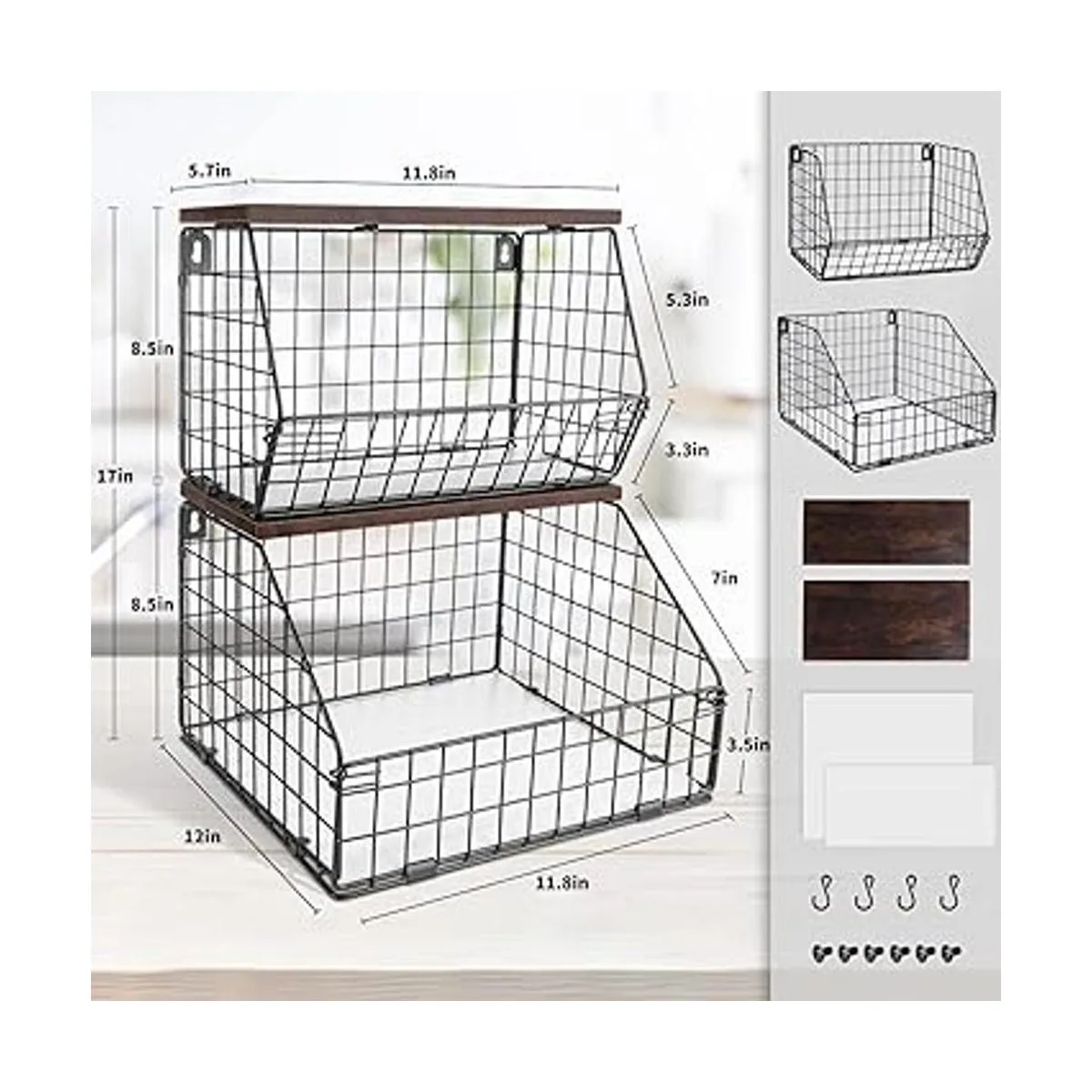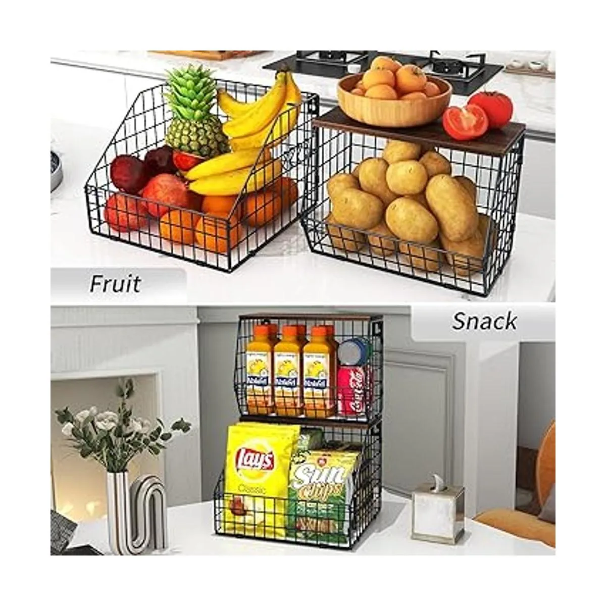 Mefirt Cesta de frutas, cestas de alambre de organización de cocina ampliadas de 2 niveles con tapa de madera, apilables montadas en la pared y en la encimera para almacenamiento de papas, almacenamiento de cebolla, aperitivos, etc