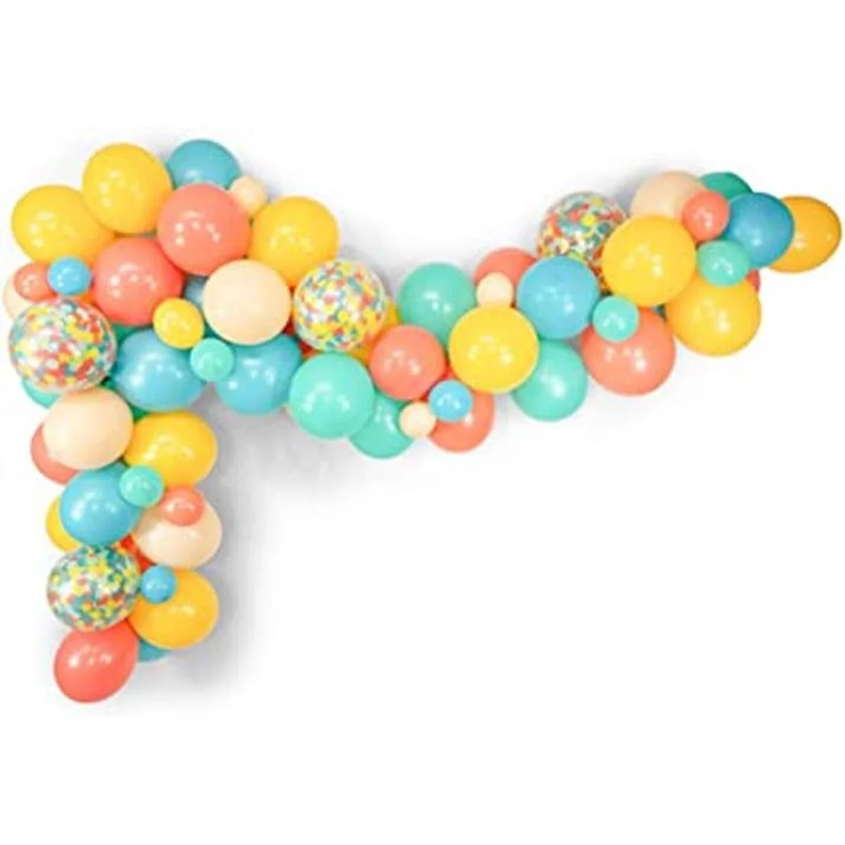 Diferentes colores: incluye 15 globos amarillos, 15 globos de coral, 15 globos azules, 15 globos azules Tiffany, 15 globos de rubor y 5 globos de confeti mixtos, 80 globos con cadena de 16.4 ft e instrucciones en total.