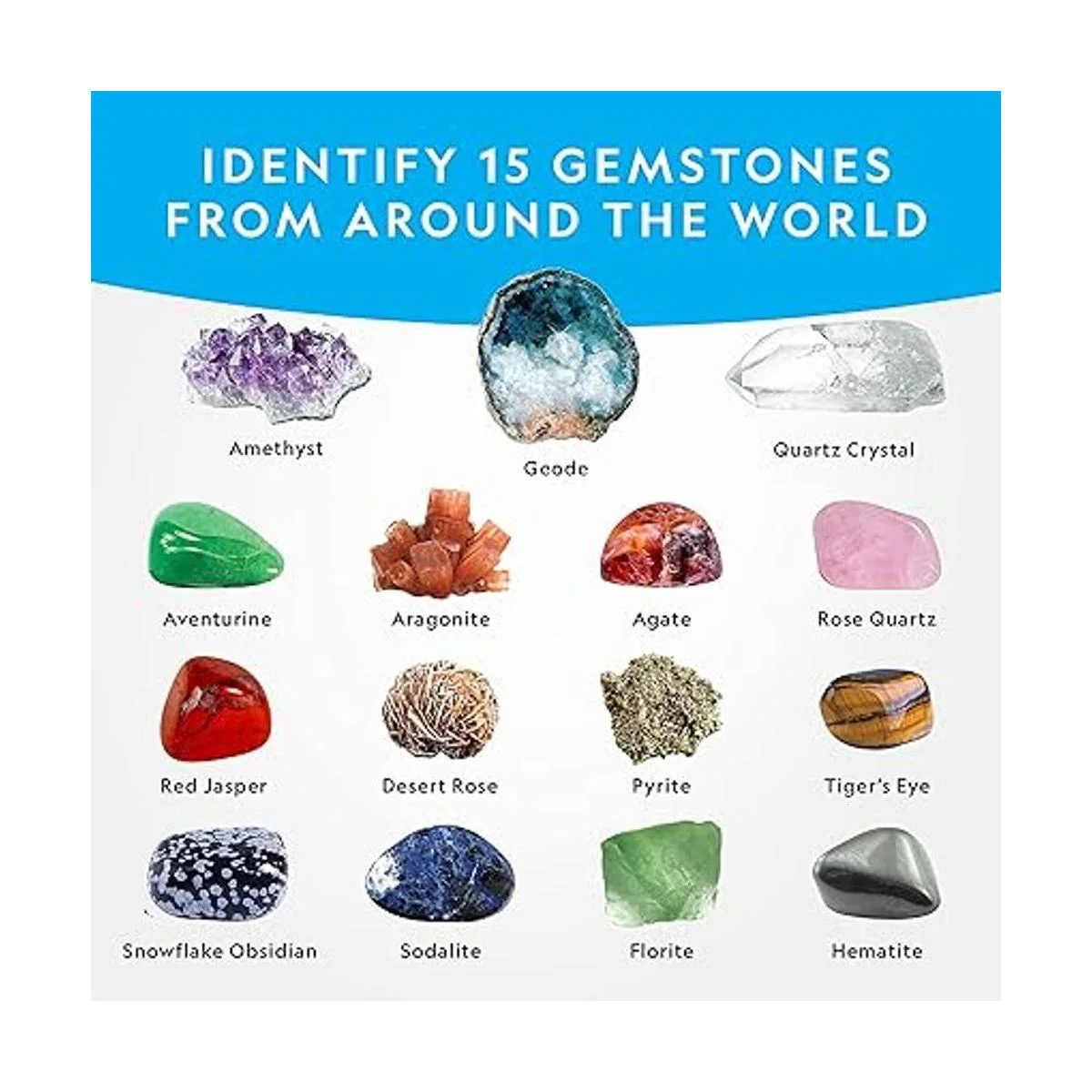 Descubrir Crystal tesoros convertirse en un tesoro cazador y comenzar una colección Rock con la 15 increíble Rocas y piedras preciosas incluido en este kit