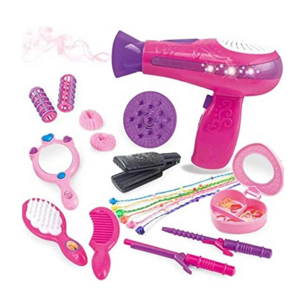 MEGAFUN Kit de juguetes de peluquería de belleza para niñas pequeñas con secador de pelo de juguete, espejo y otros accesorios, juego de maquillaje de moda para niños