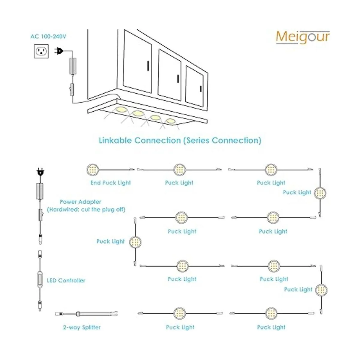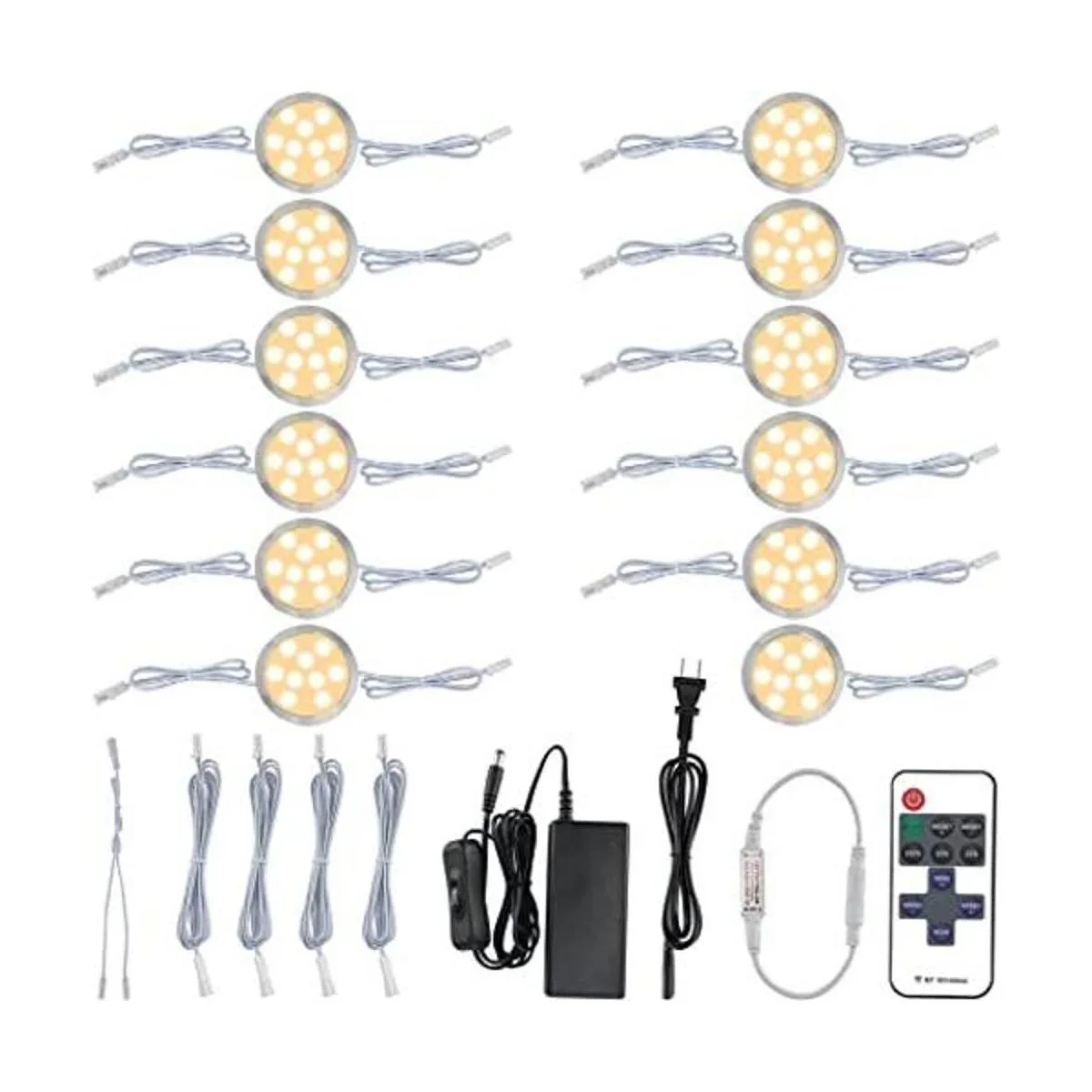 Meigour Curio Kit de luces LED redondas regulables para debajo de la encimera, con cable de 120 V con cable sobre el gabinete, 12 luces, blanco cálido