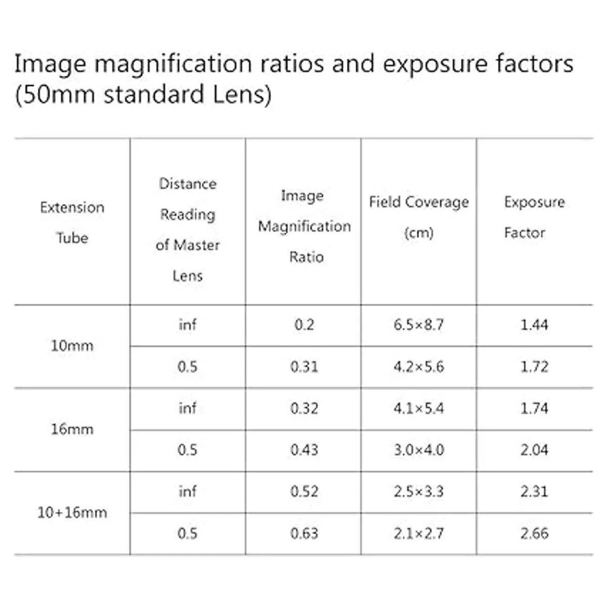 El tubo de extensión macro se puede utilizar solo o superpuesto. Cuando se utilizan solo los tubos de extensión 0.394 in o 0.630 in o combinación 0.394 in 0.630 in 1.024 in, la longitud focal de la lente debe ser mayor que la longitud 0.394 in 0.630 in o 1.024 in del tubo.