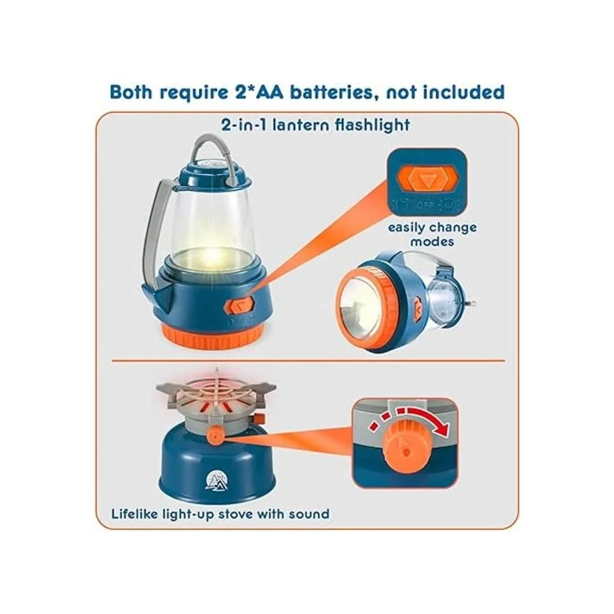 Linterna de flash 2 en 1 realista y estufa de campamento: la linterna puede iluminar brillante para las necesidades de camping de los niños o jugar en el patio, puede cambiar fácilmente a linterna con solo deslizar el botón. La pequeña estufa de camping puede iluminar con un sonido realista que hace que los juegos de simulación sean casi reales. Ambos requieren 2 pilas AA no incluidas
