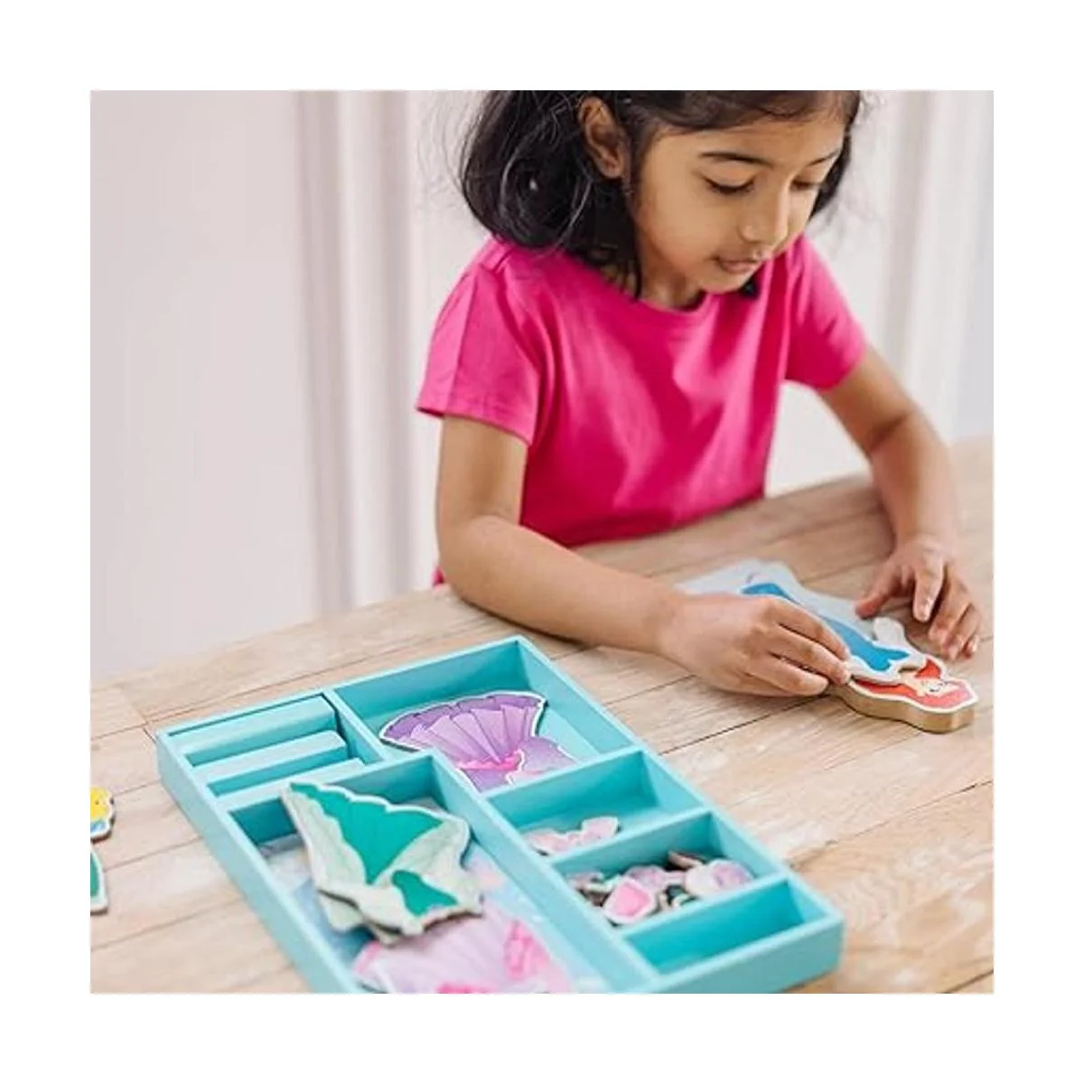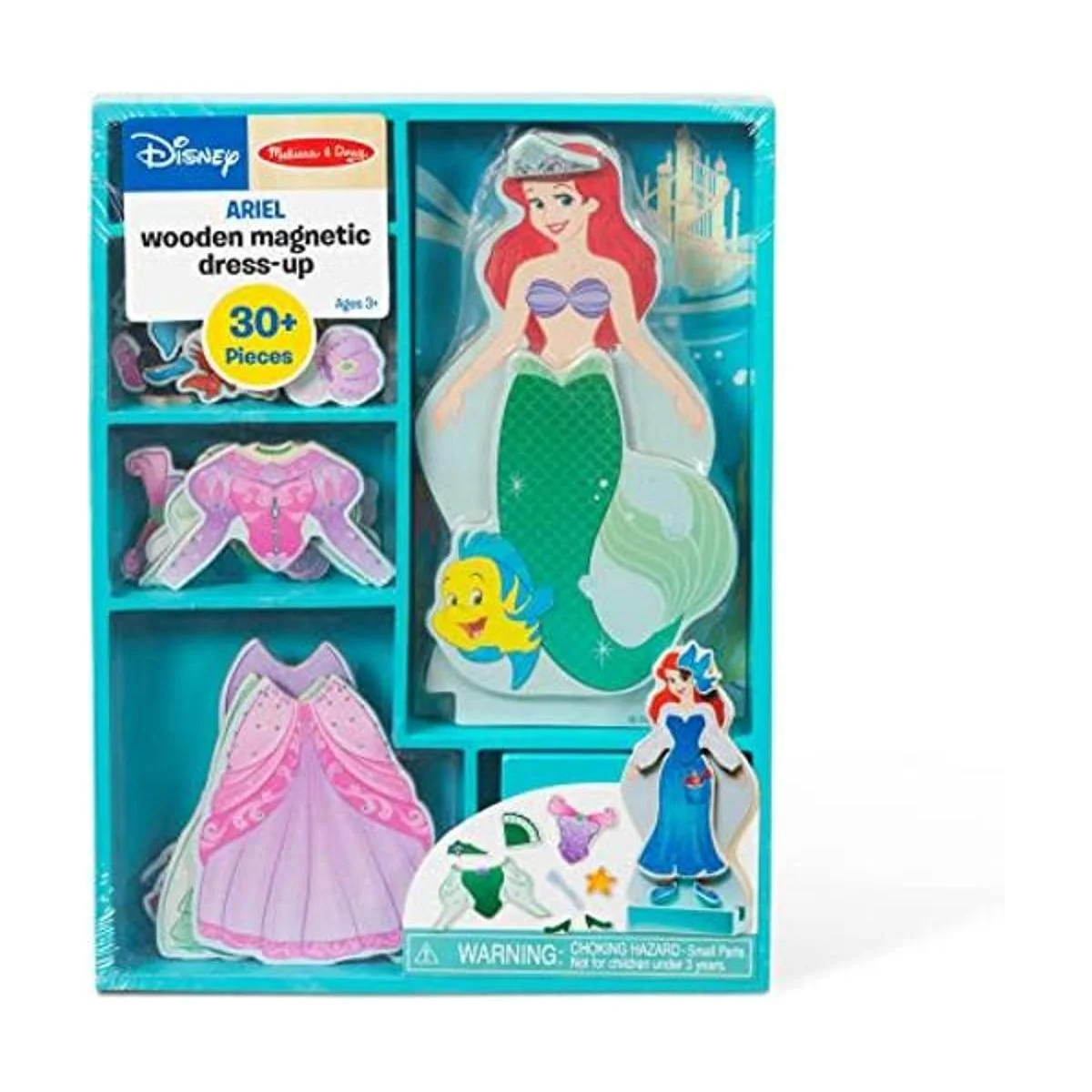 Juego de disfraz Ariel: el juego magnético de madera Melissa Doug Disney Ariel incluye una figura de juego de madera, una variedad de piezas magnéticas de ropa y accesorios, y soporte para muñecas.